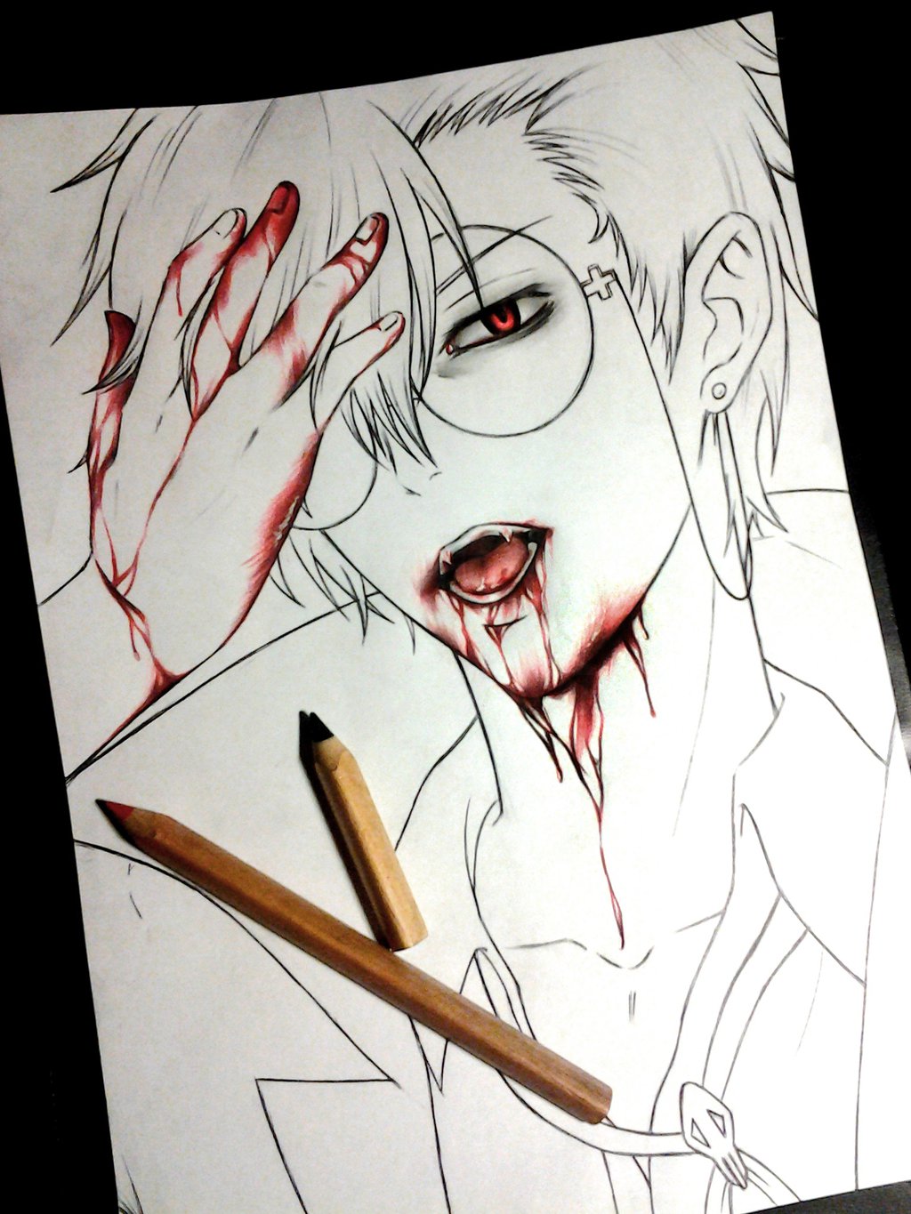 Description: A drawing of a man with blood on his face and a pencil in his hand next to a drawing of a bloody man.