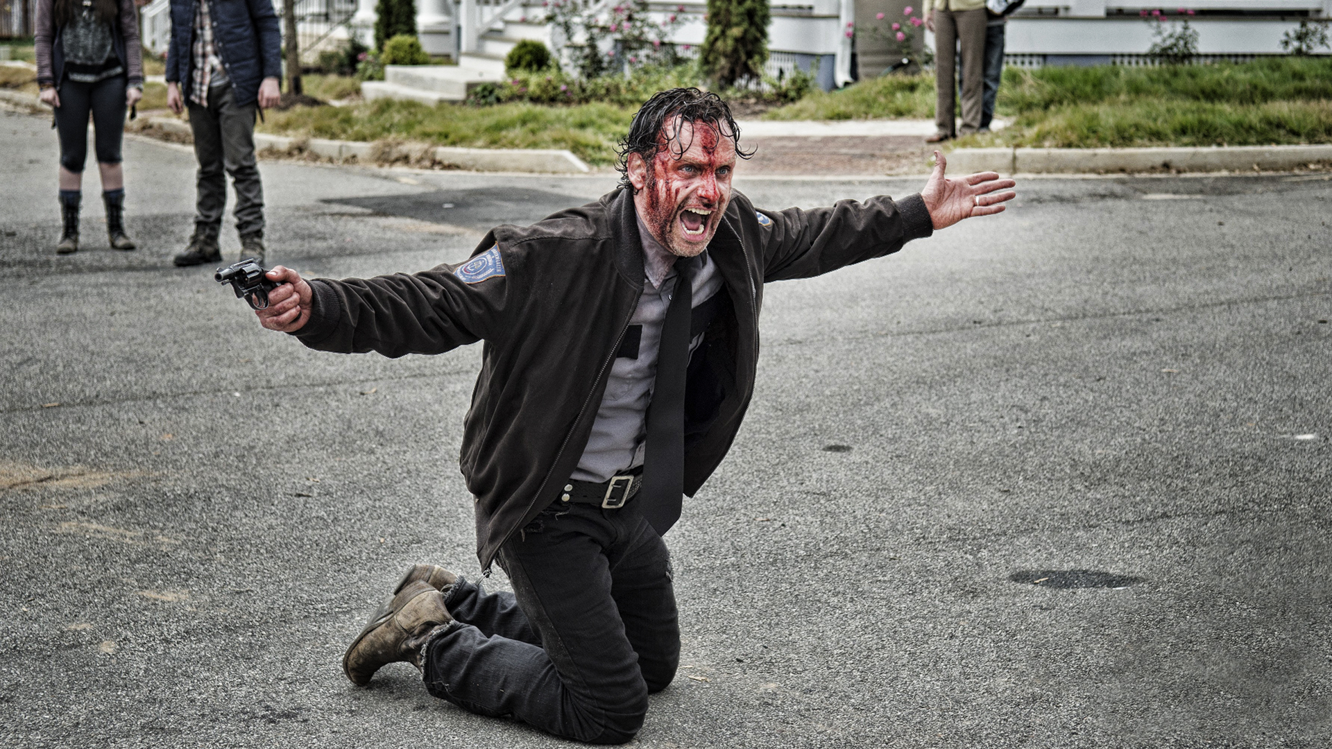 Description: A man with a bloody face is on the ground with his arms out and hands out in the air.