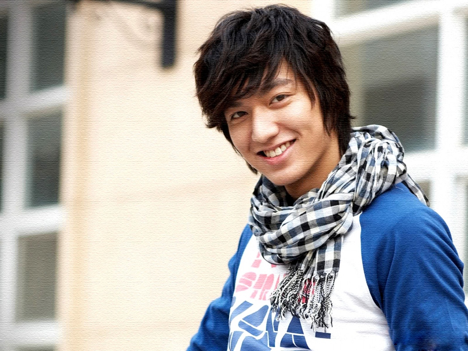 Description: A man with a scarf around his neck and a building in the background with windows and a clock on it.
