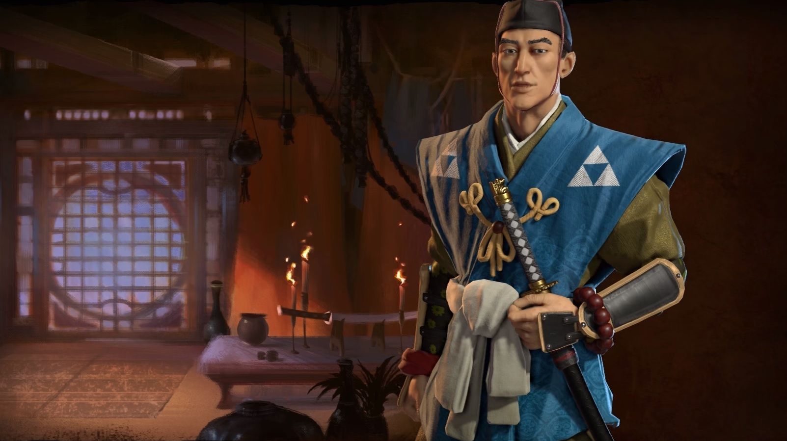 Description: A man in a blue and green uniform holding a sword and a sword in his hand and a window behind him.