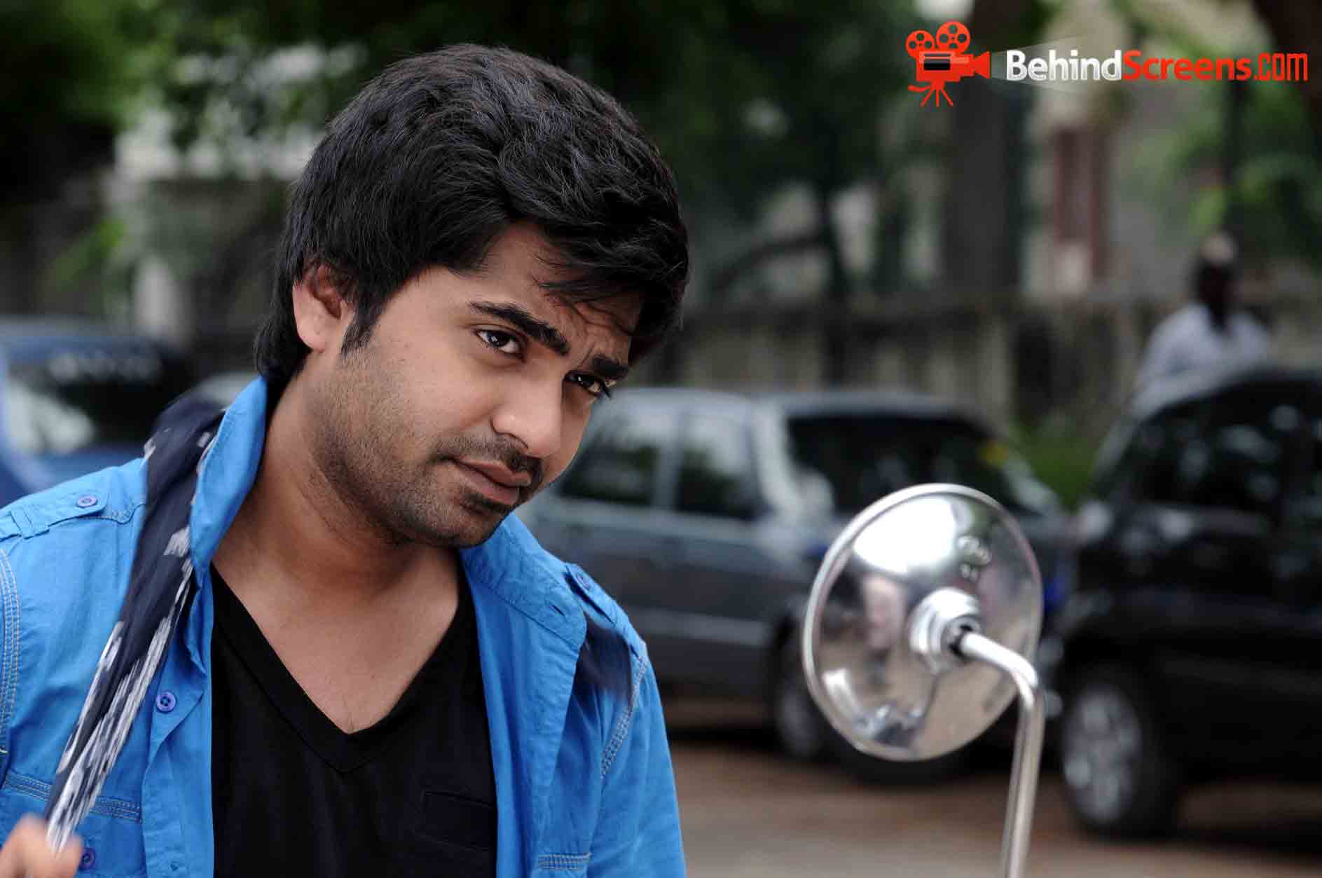 Description: A man with a blue jacket and a black shirt is standing in front of a silver car and a mirror.