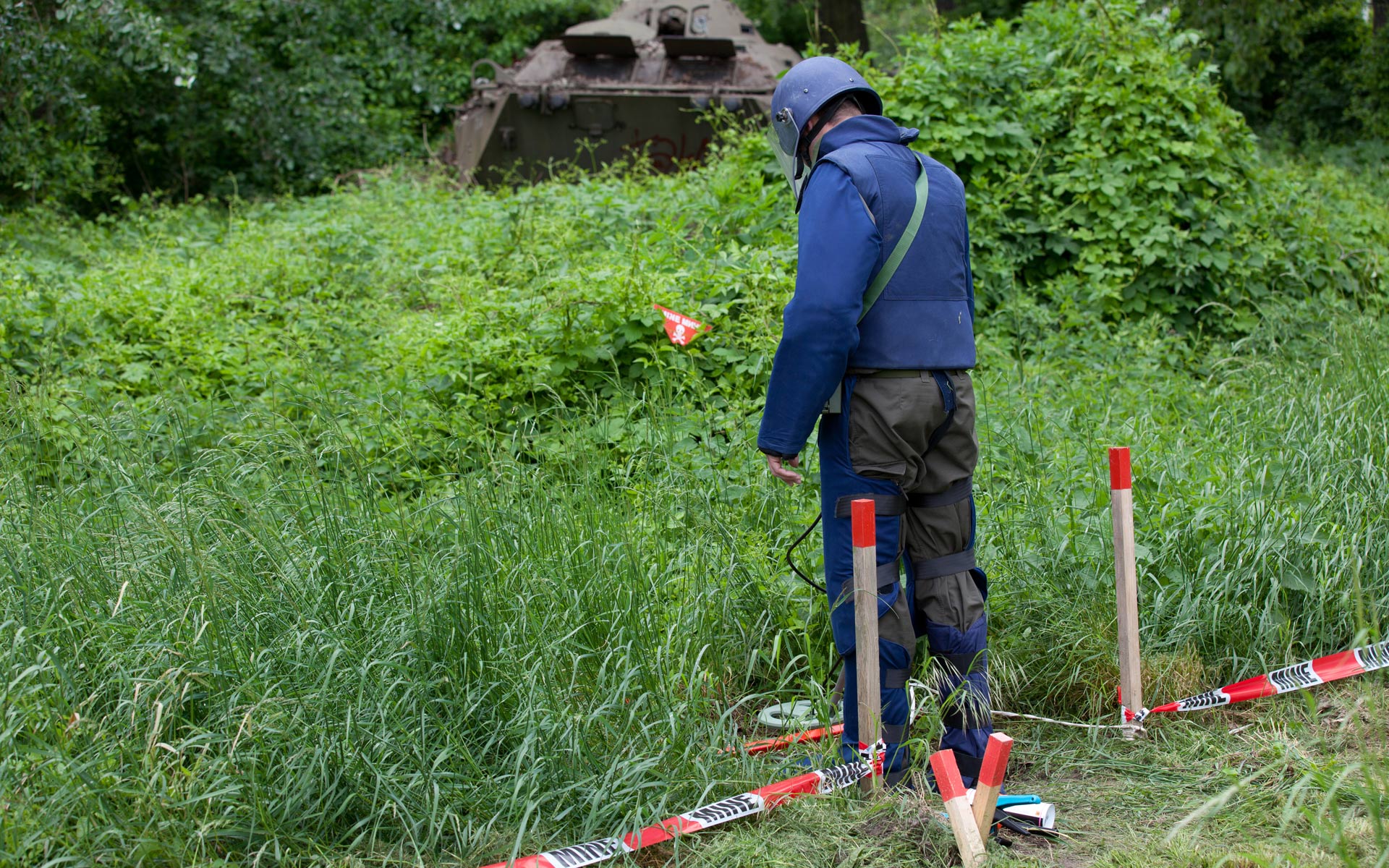 Description: A man in a blue jacket is standing near a red and white marker and a blue backpack and a blue and white backpack.
