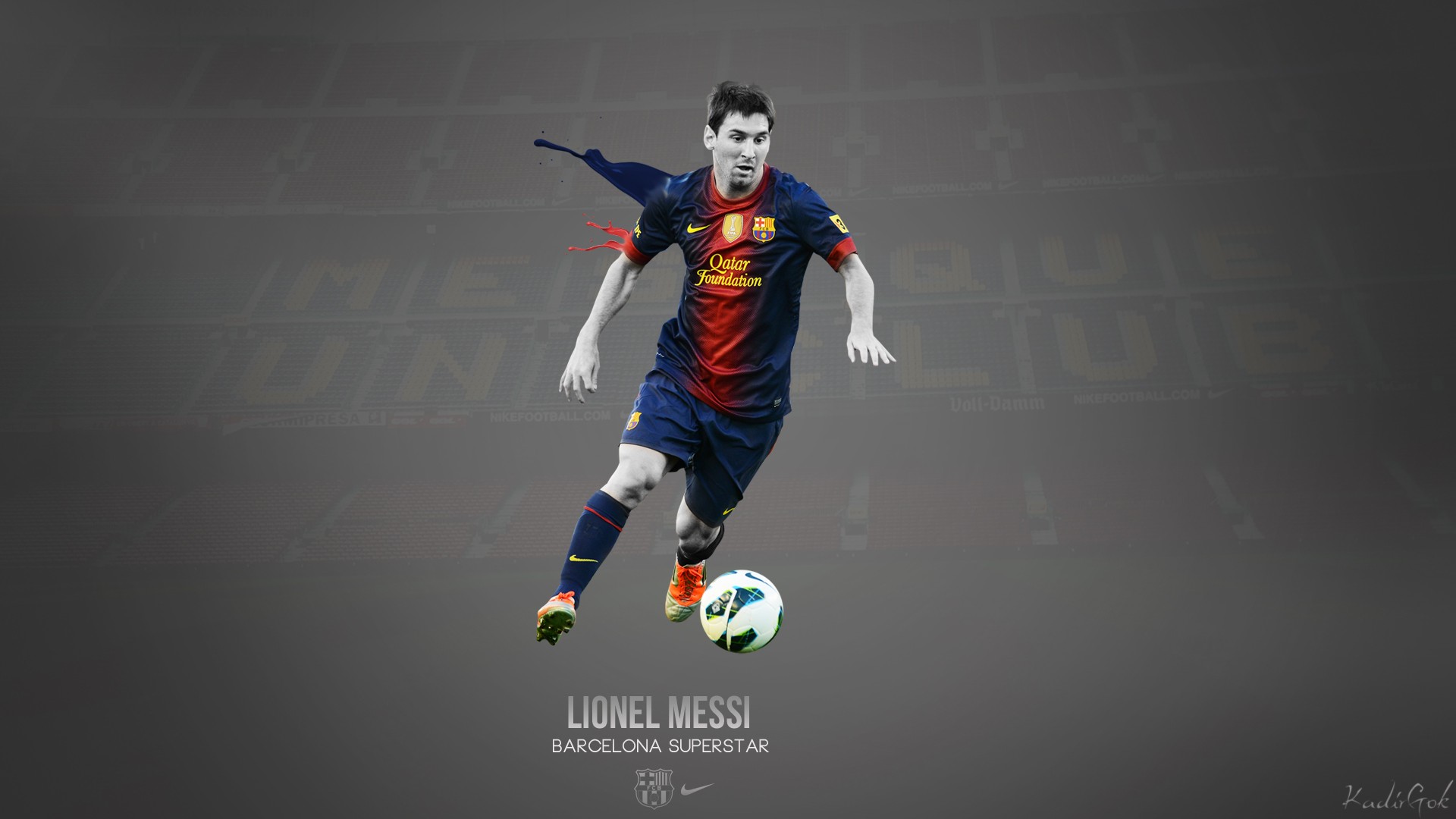 Description: A man in a blue and red uniform kicking a soccer ball with his right hand and his left leg.