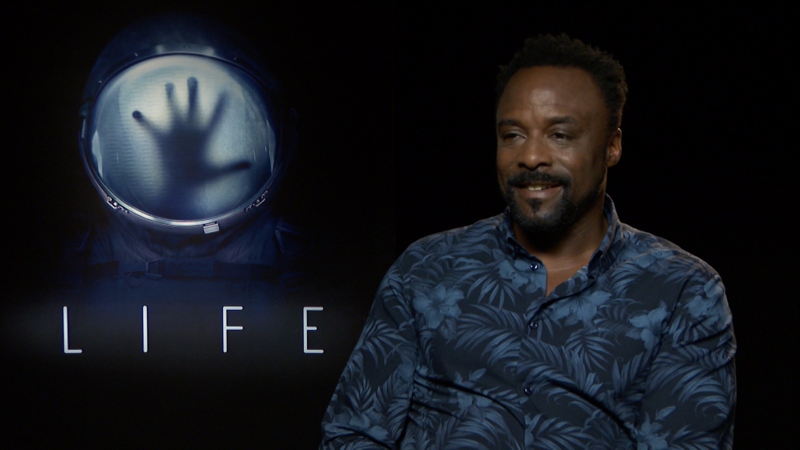 Description: A man in a blue shirt is sitting in front of a sign with a hand on it and a hand on the screen.
