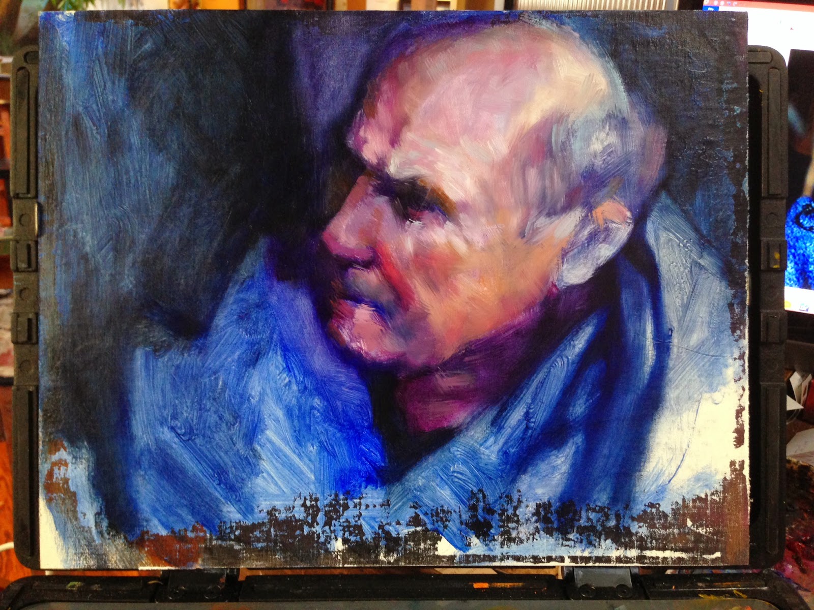 Description: A painting of a man with a blue shirt on is in a box with other items on the table.