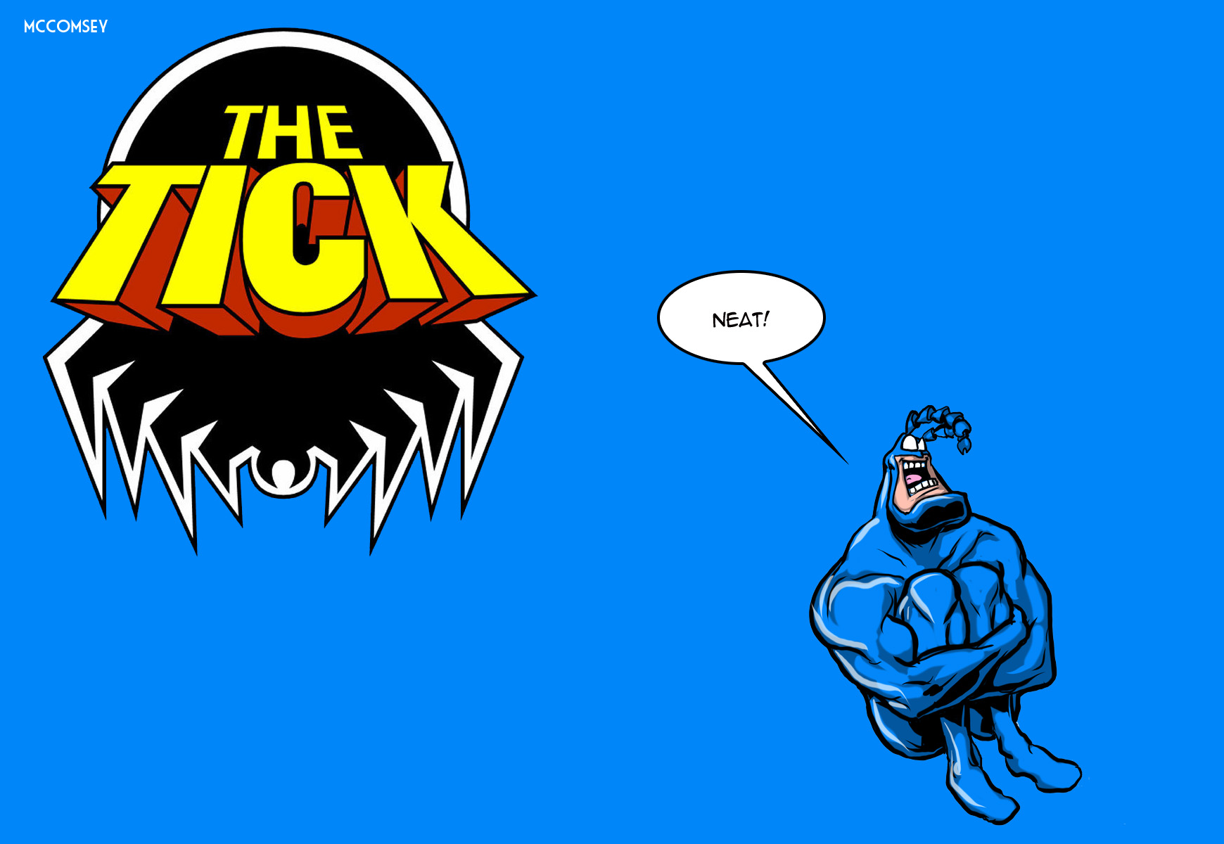 Description: A man in a blue suit is looking at a cartoon character with a speech bubble in his mouth that says the tick.