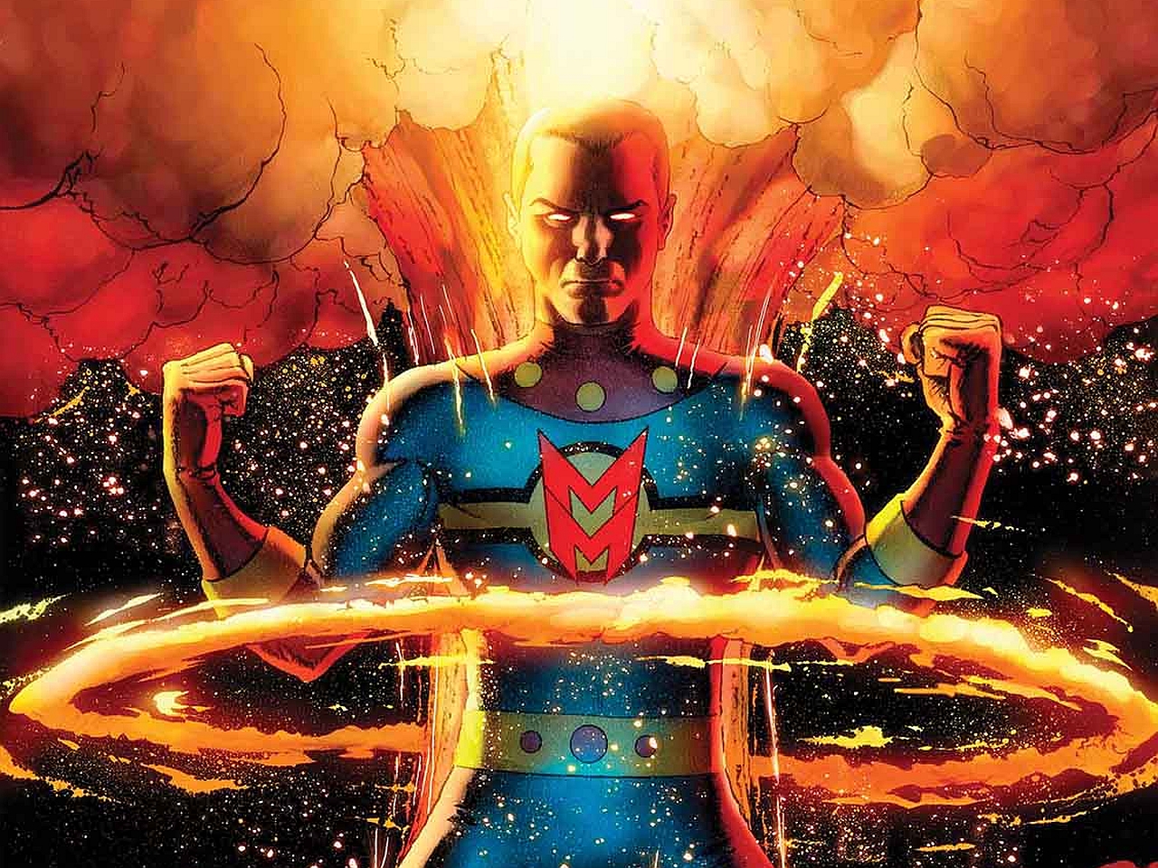 Description: A man in a blue suit with a red and yellow ring around his neck and arms in the air.