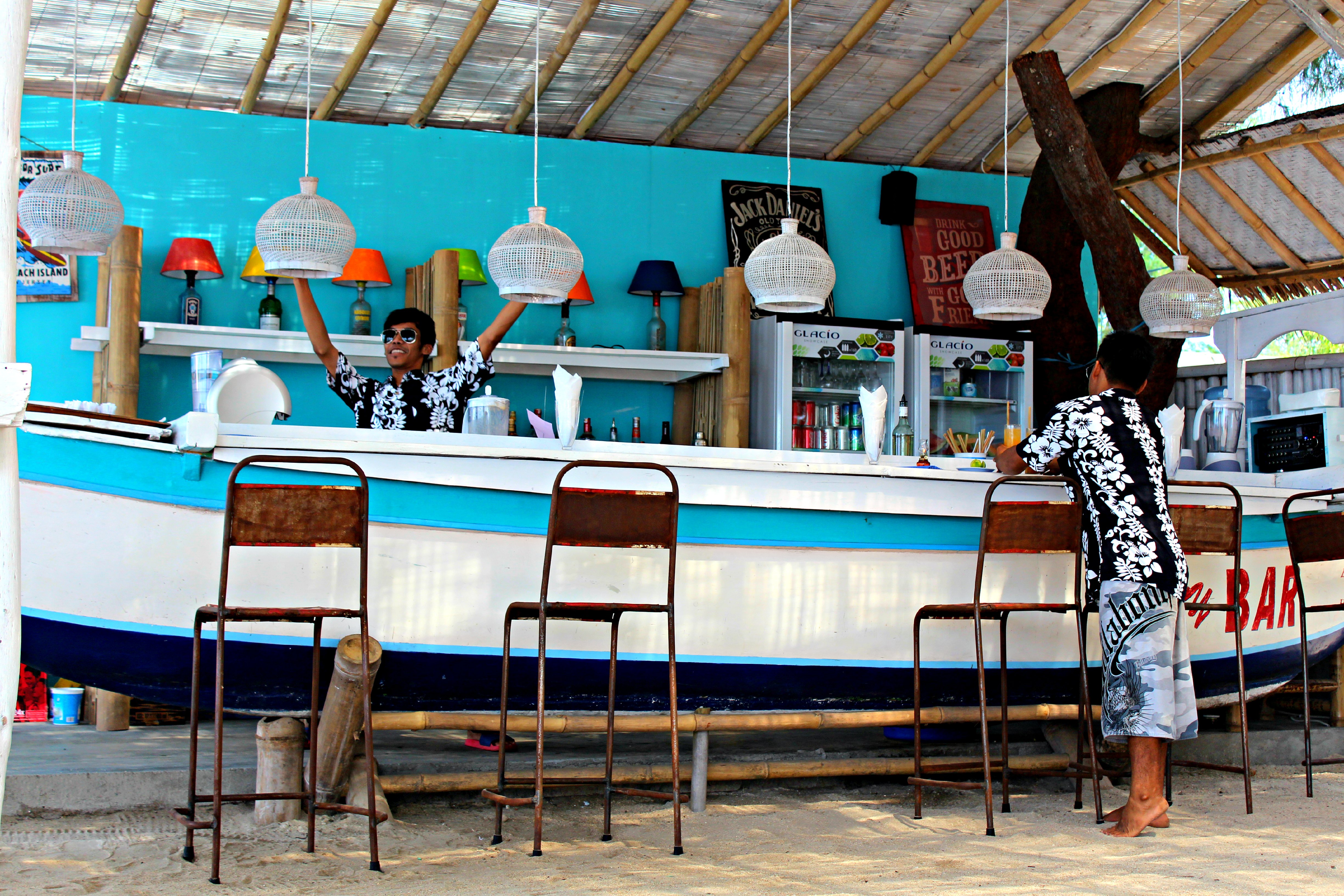 Description: A man standing in front of a boat at a bar with chairs and a counter with a bar top.