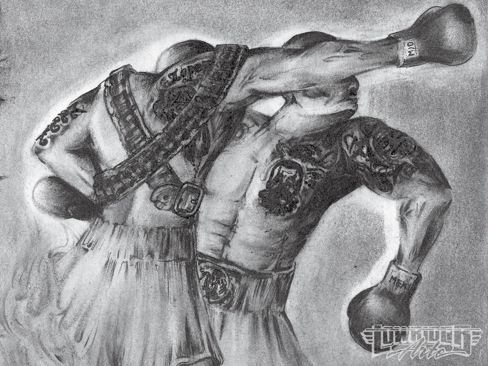 Description: A drawing of a man with a bottle in his mouth and a woman in a dress behind him with a gun.
