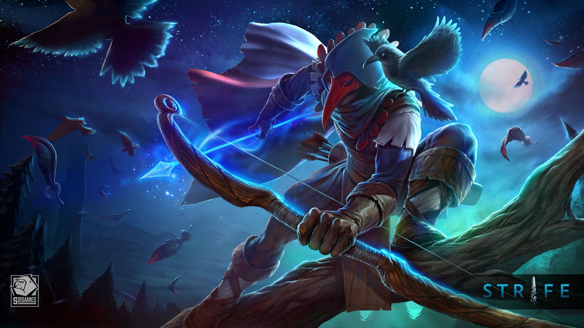 Description: A man with a bow and arrow in a forest with birds flying around him and a moon in the sky.
