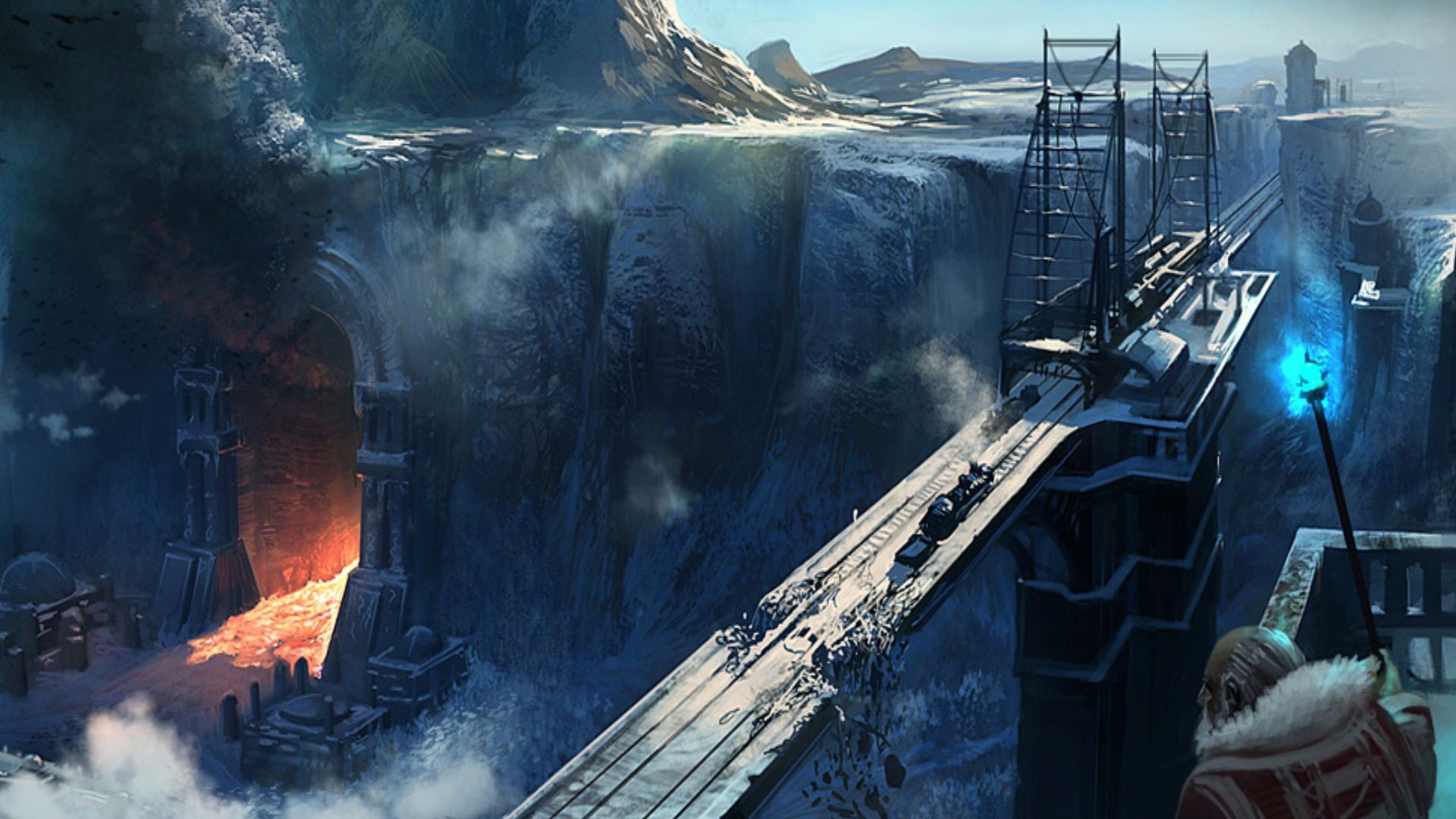 Description: A man standing on a bridge over a mountain with a fire in the middle of it and a mountain in the background.