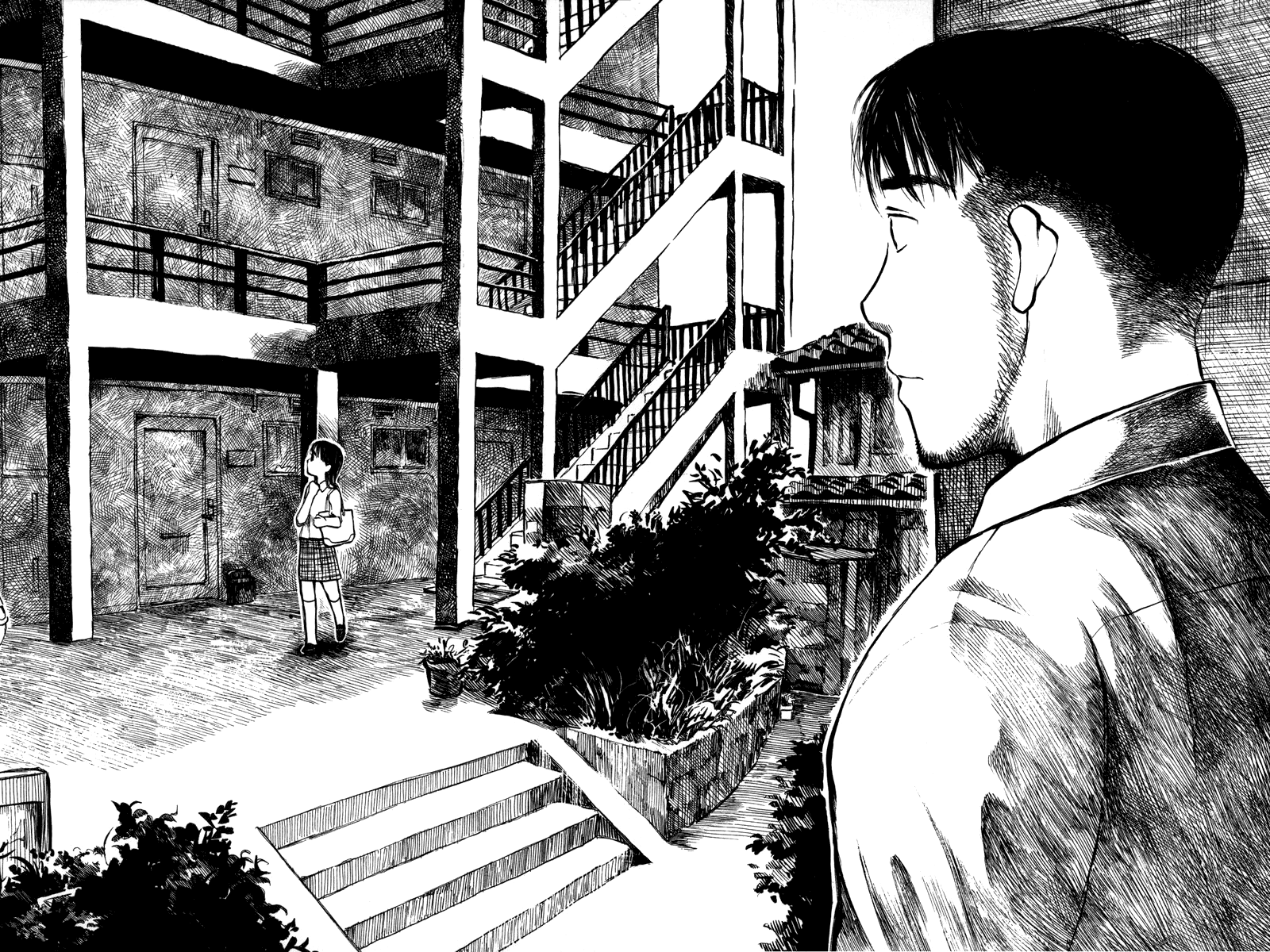 Description: A man standing in front of a building next to a planter filled with flowers and a woman standing in the background.
