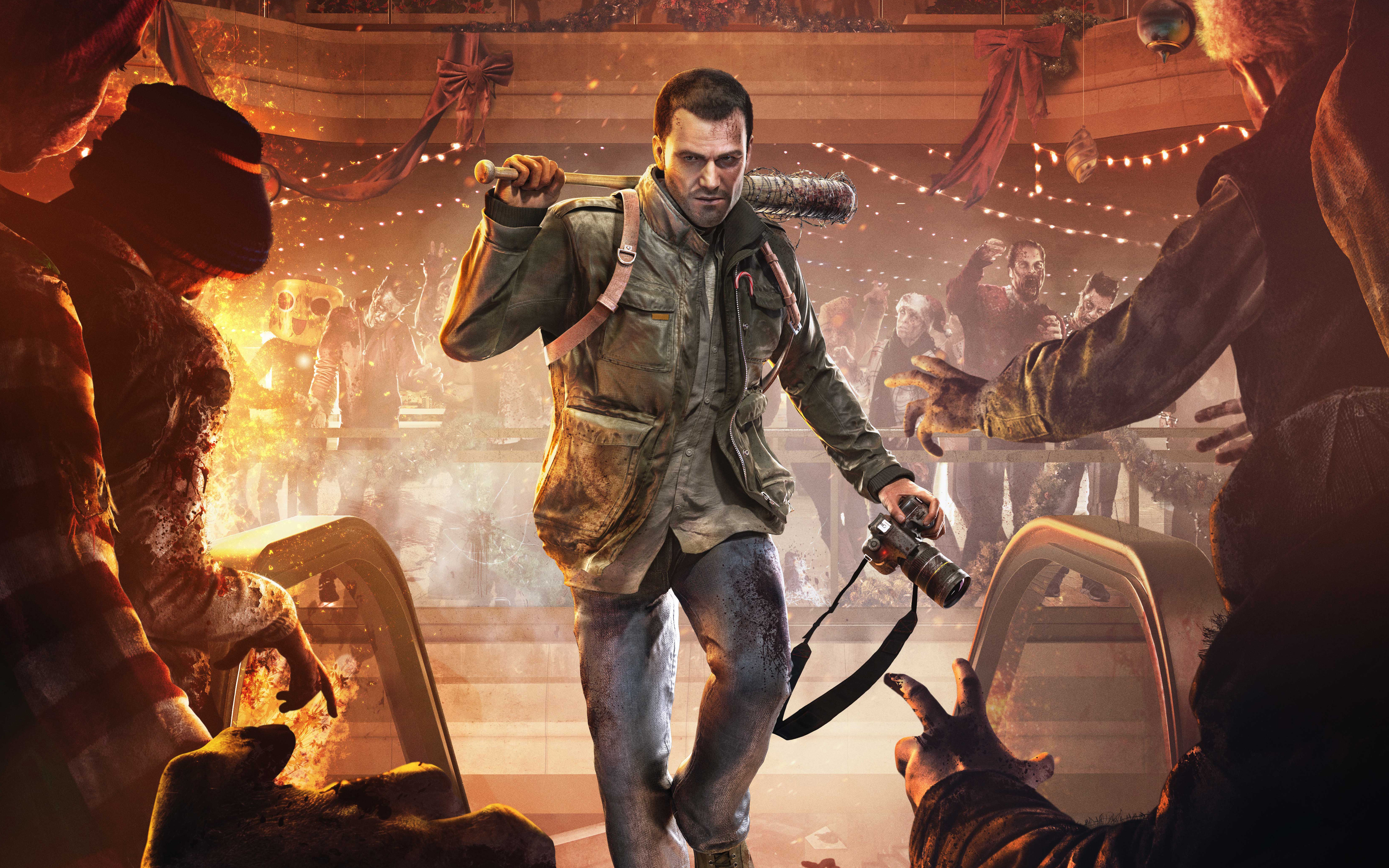 Description: A man with a camera walking through a crowded room with a dog on a leash and a fire in the background.