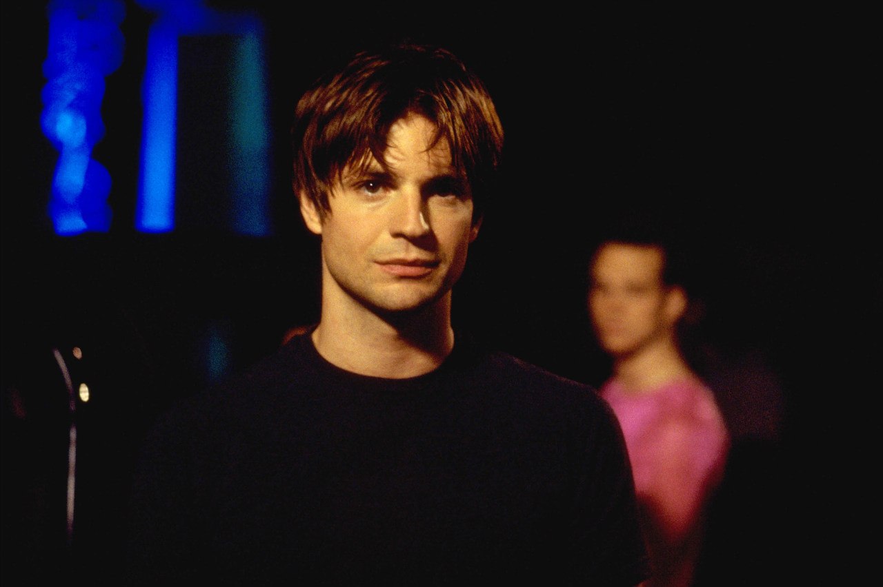 Description: A man standing in front of a camera in a dark room with another man in the background looking at the camera.