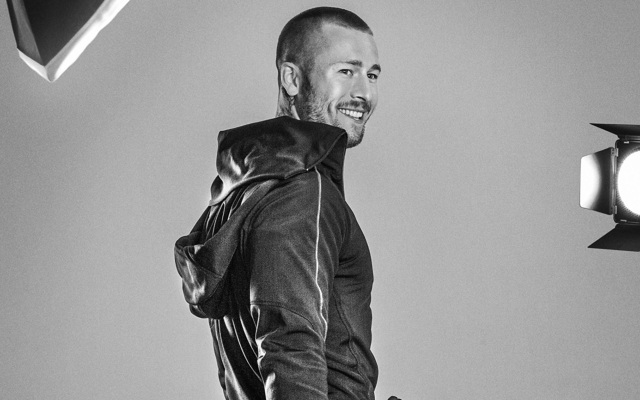 Description: A man standing in front of a camera and a light on a pole with a camera attached to it.