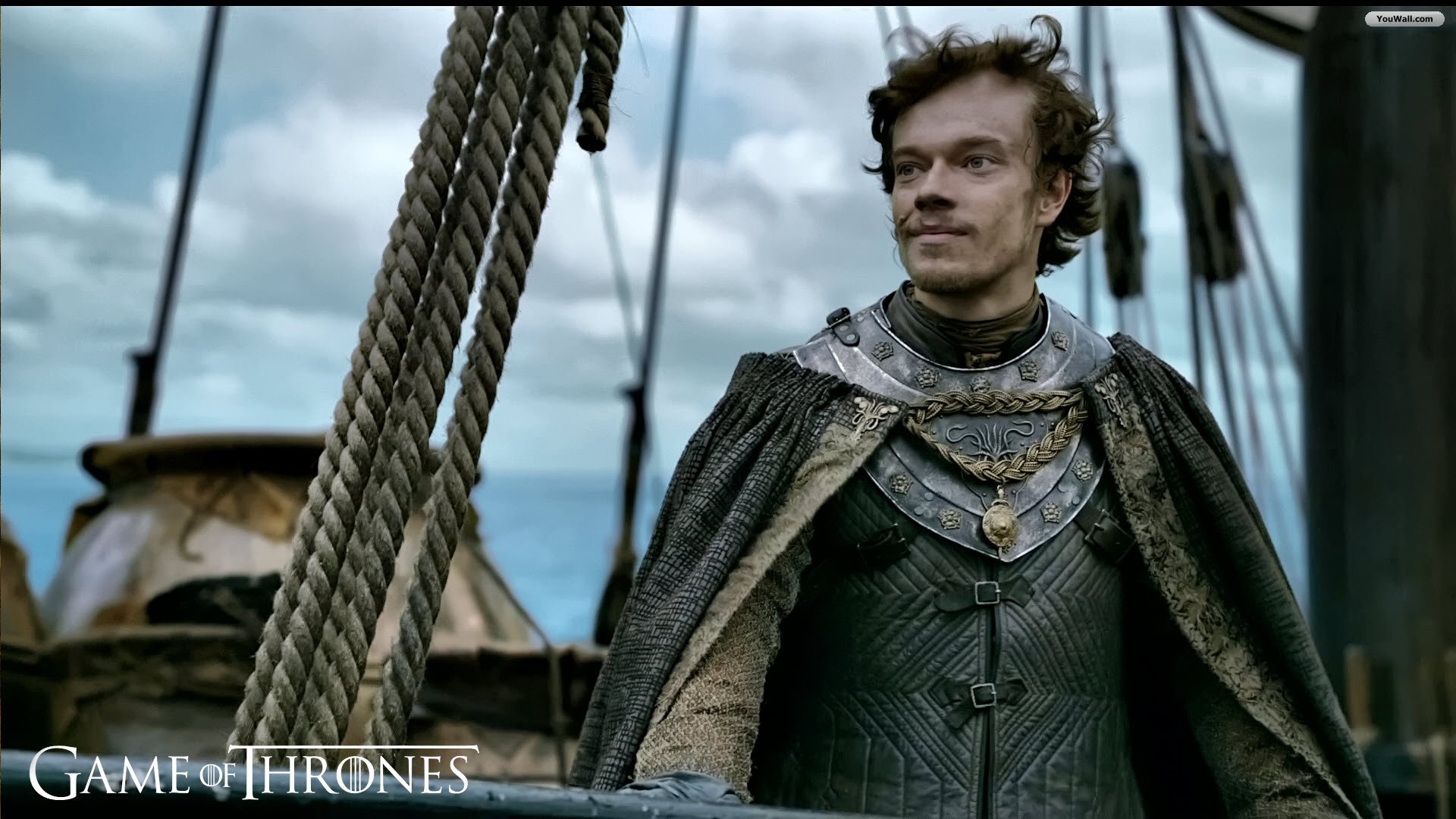 Description: A man in a cape standing on a boat in the ocean with a cloudy sky behind him and a rope in the foreground.