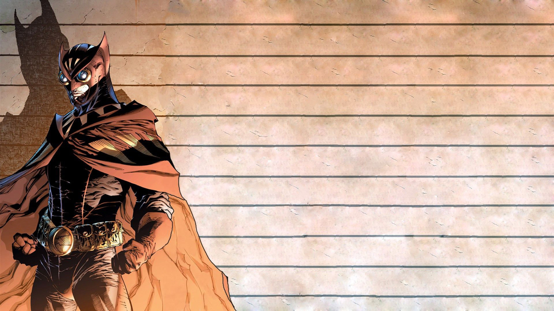 Description: A man in a cape and mask standing in front of a wall with a sign that says.