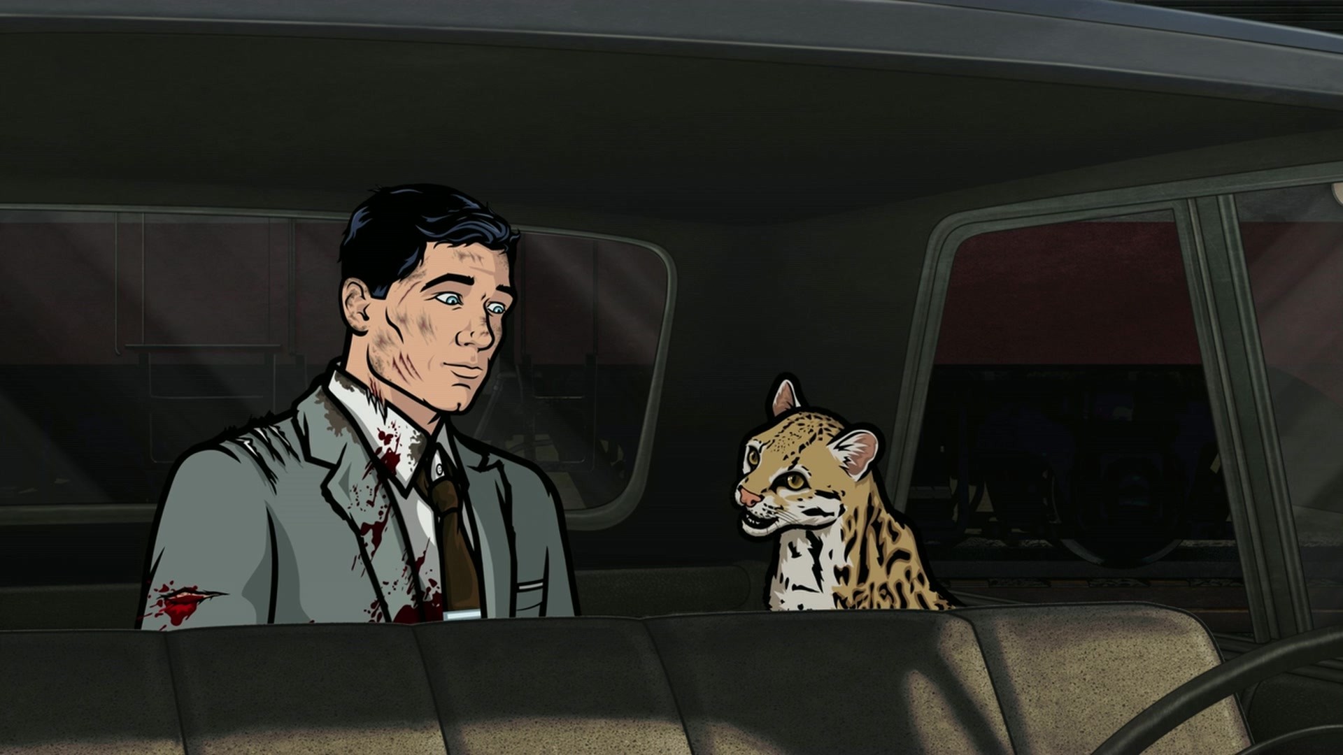 Description: A man in a car with a leopard on the dashboard and a car door open to the side of the car.