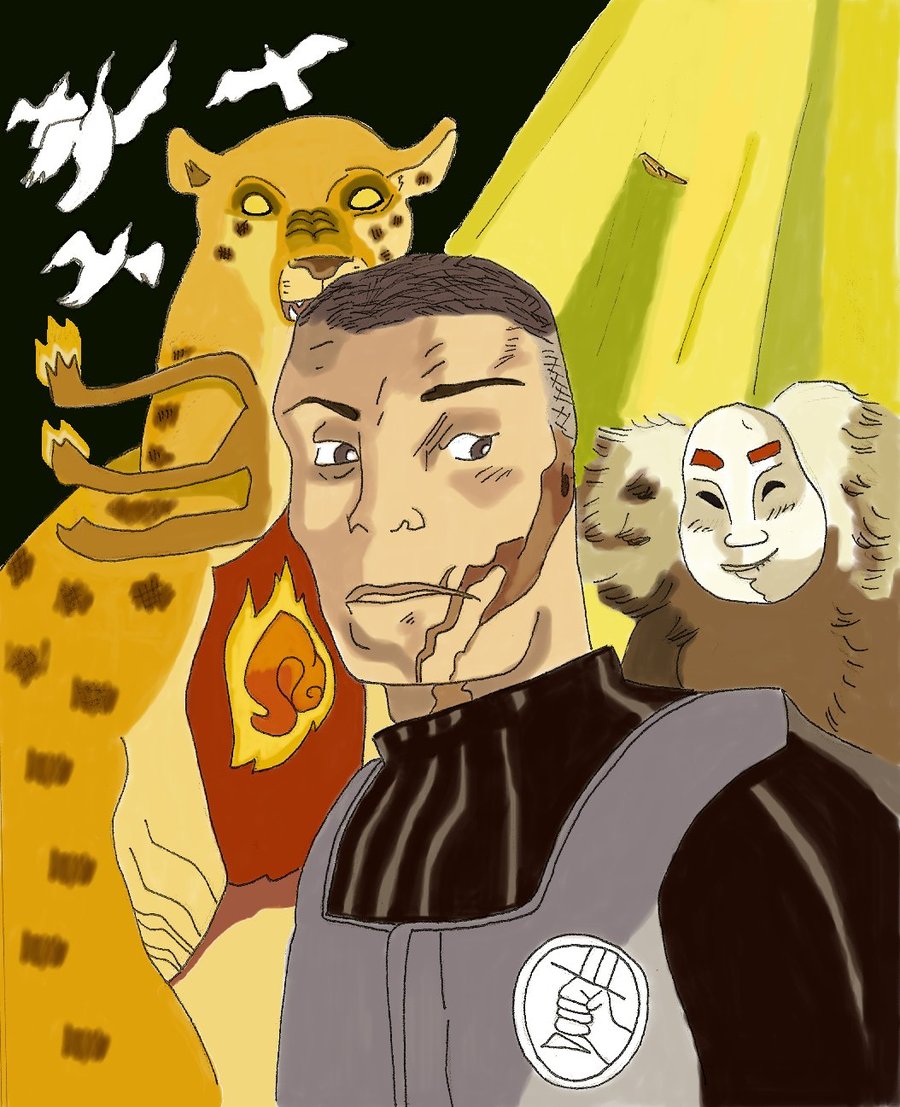 Description: A man with a cat and a tiger on his back and a bird on his shoulder and a cat on his shoulder.