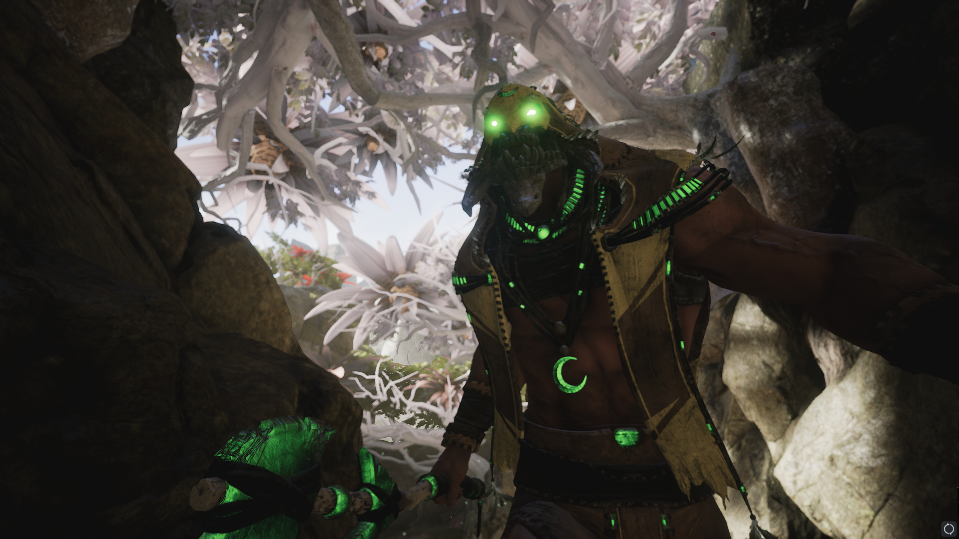 Description: A man in a cave with green glowing eyes and a green mask on his face and body.