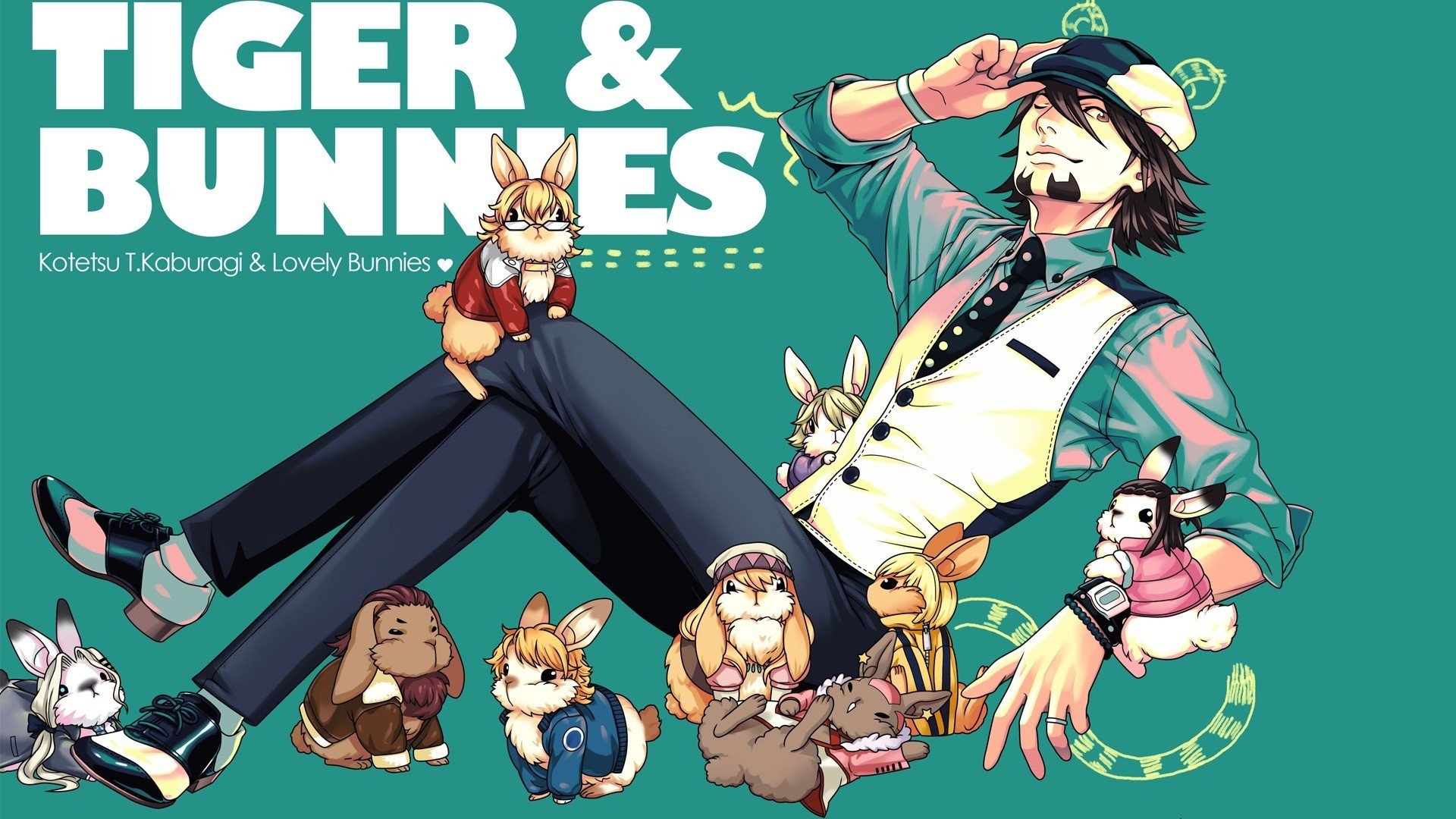 Description: A man sitting on top of a chair surrounded by animals and cats in front of a green background with the words tiger and bunnies.