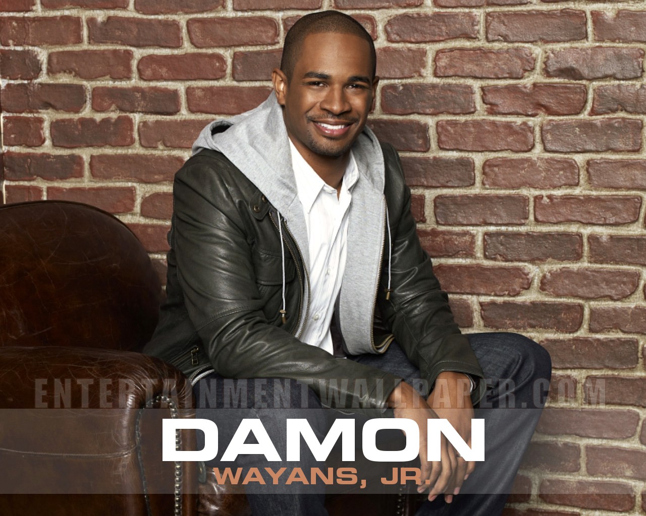 Description: A man sitting on a chair in front of a brick wall with the words damnon on it and a picture of him.