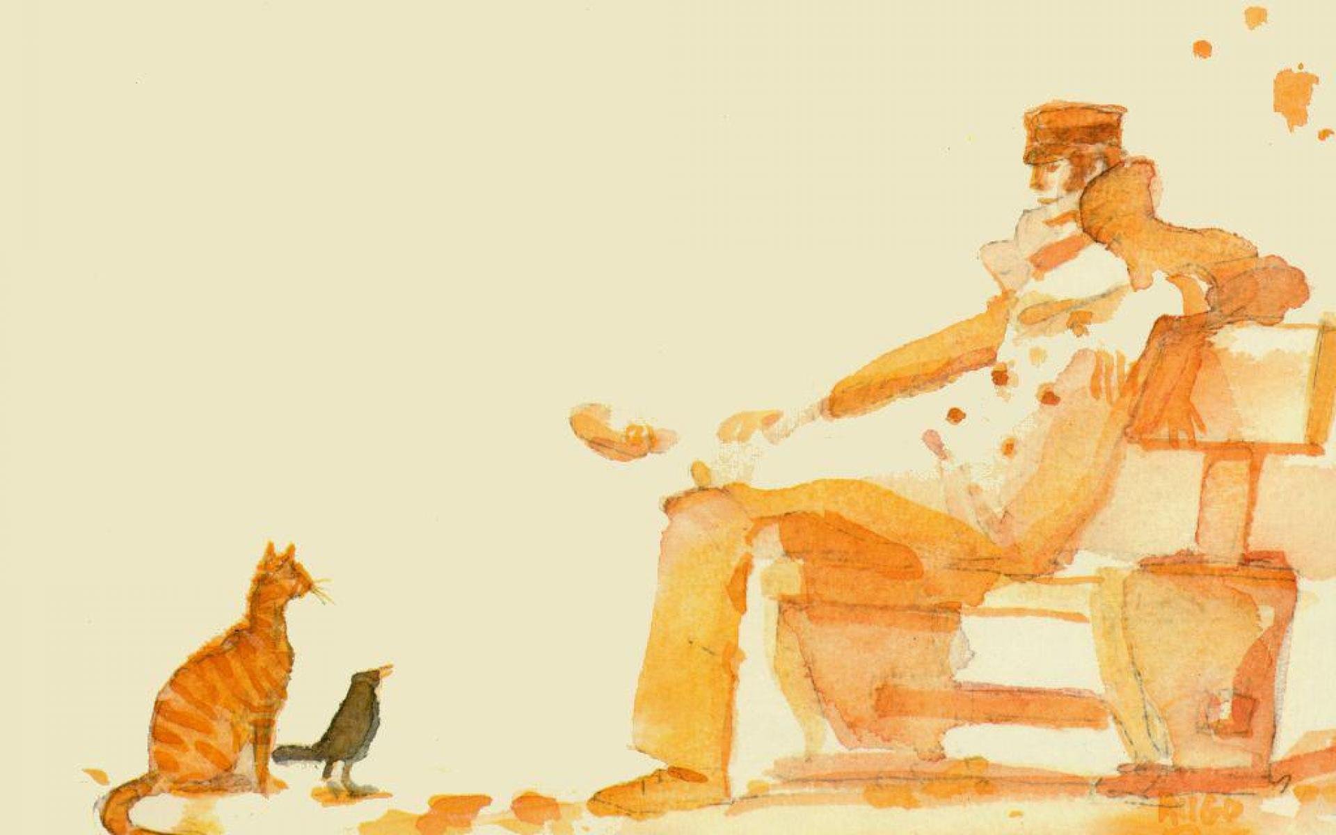 Description: A painting of a man sitting on a chair with a cat and a bird nearby on a white background.