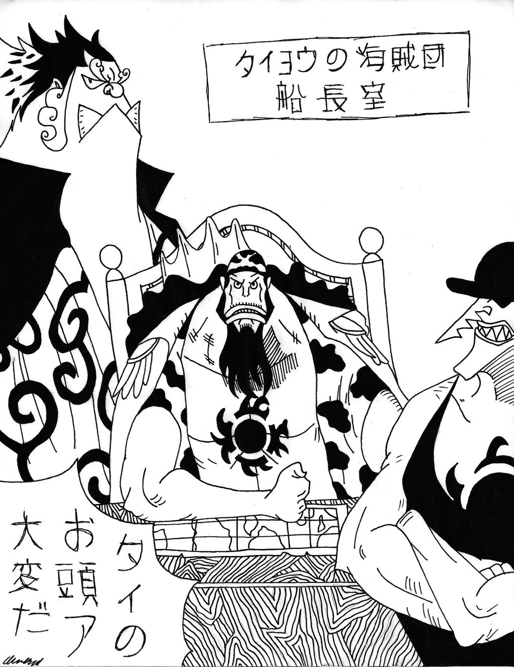 Description: A drawing of a man sitting in a chair with a horse and a man standing next to him with a hat on.