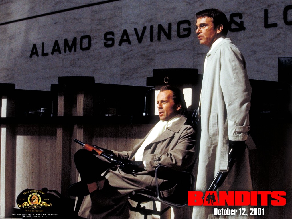 Description: A man sitting in a chair next to another man in a suit and tie with a gun in his hand.