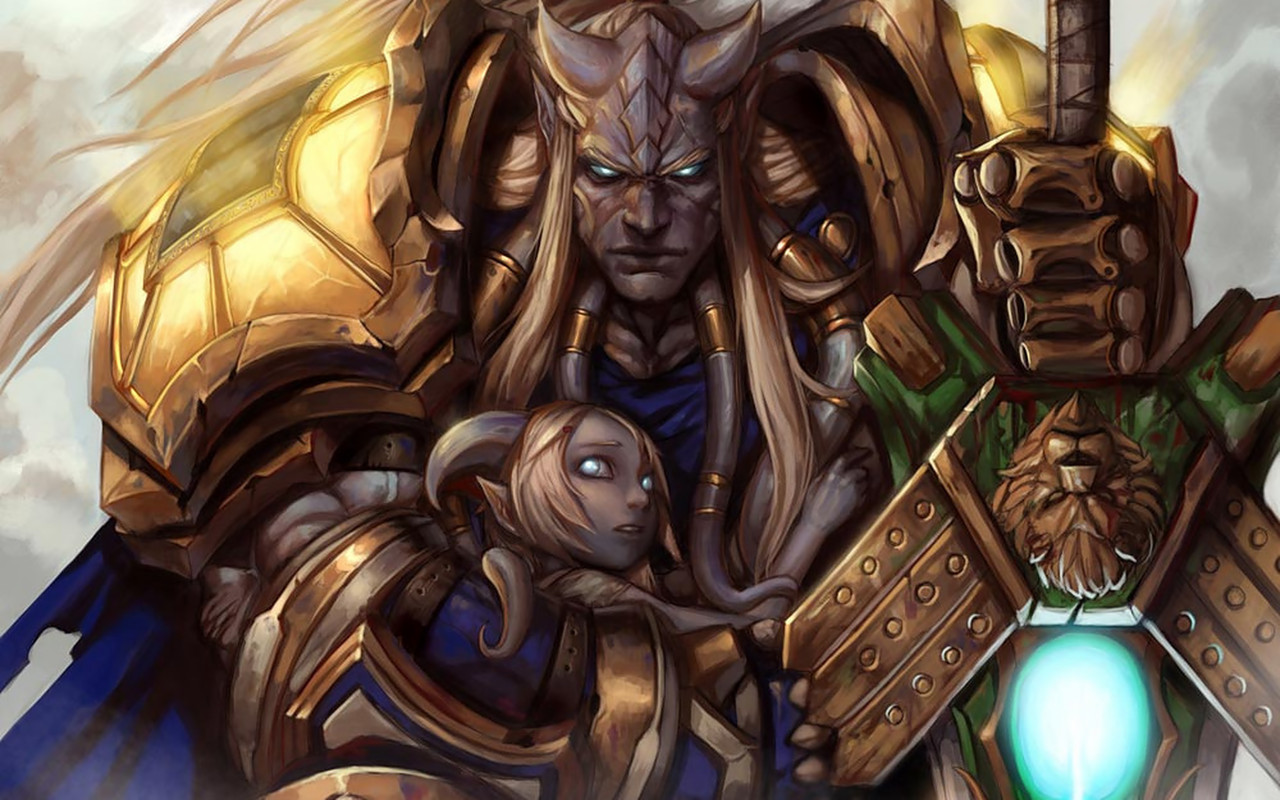 Description: A painting of a man holding a child in his arms and a giant robot behind him with a glowing green light.