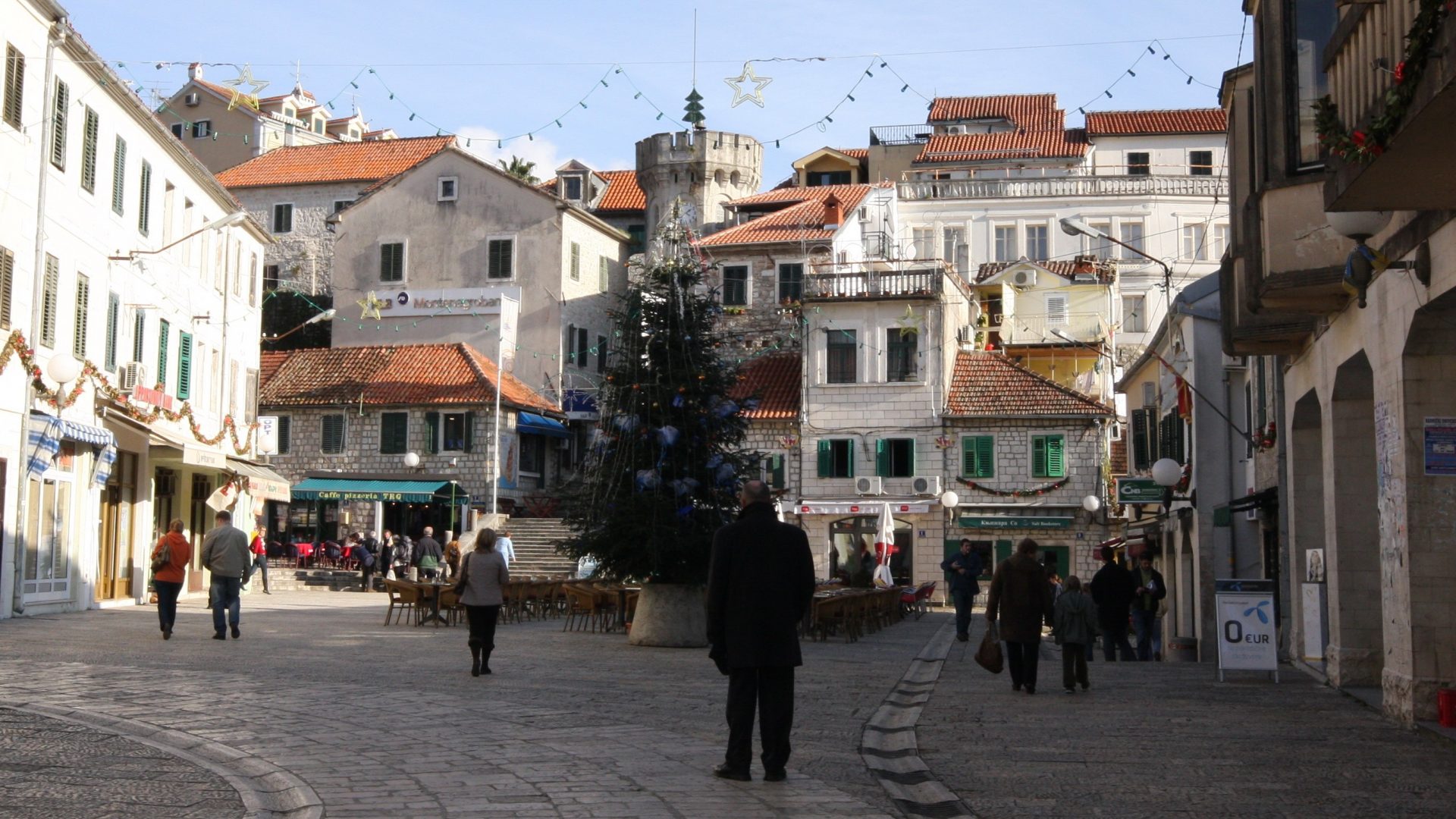 Description: A man standing in a street next to a christmas tree in a town square with people walking around it.