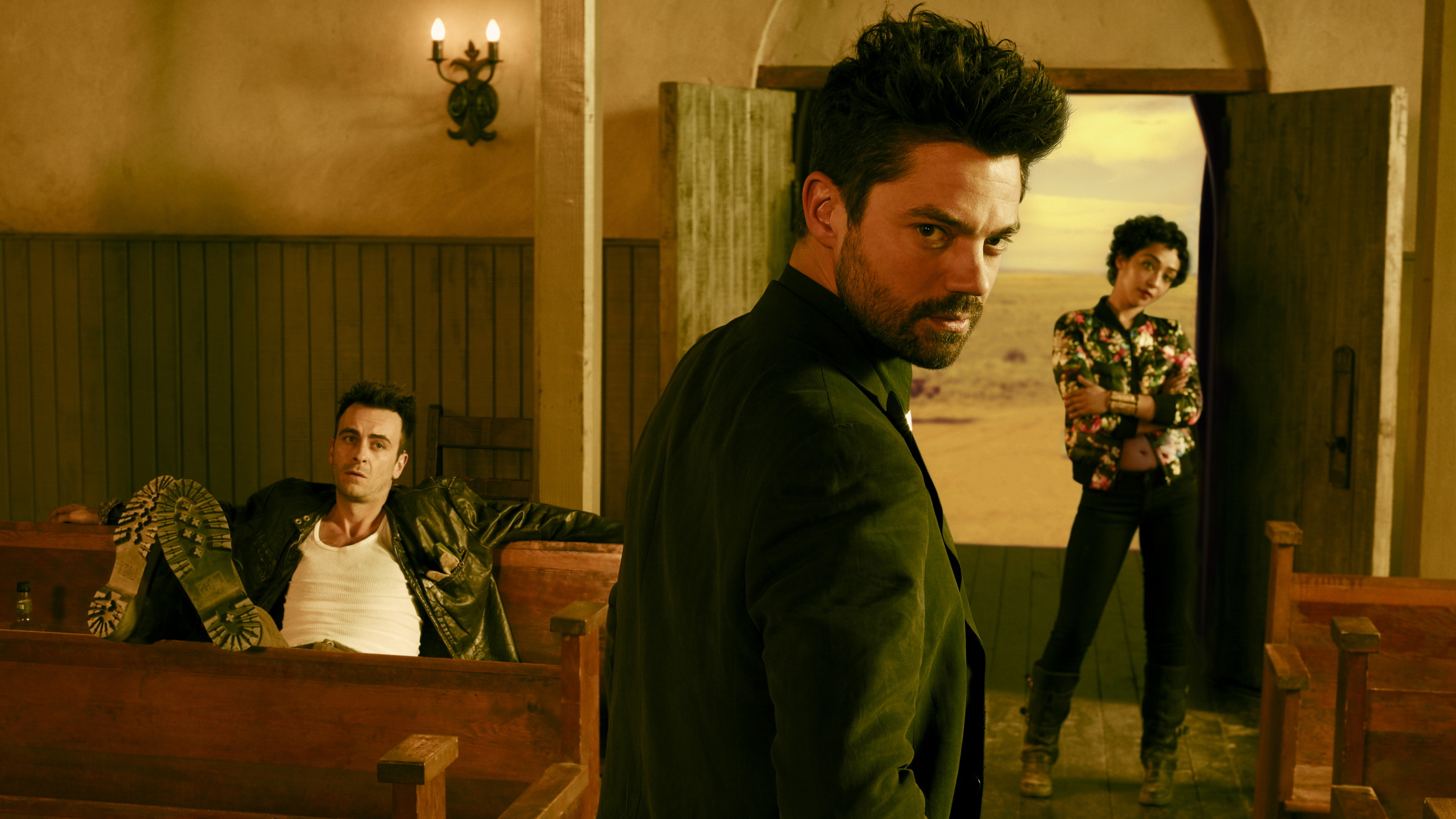 Description: A man standing in a church with another man sitting in the pews behind him and another man standing behind him.
