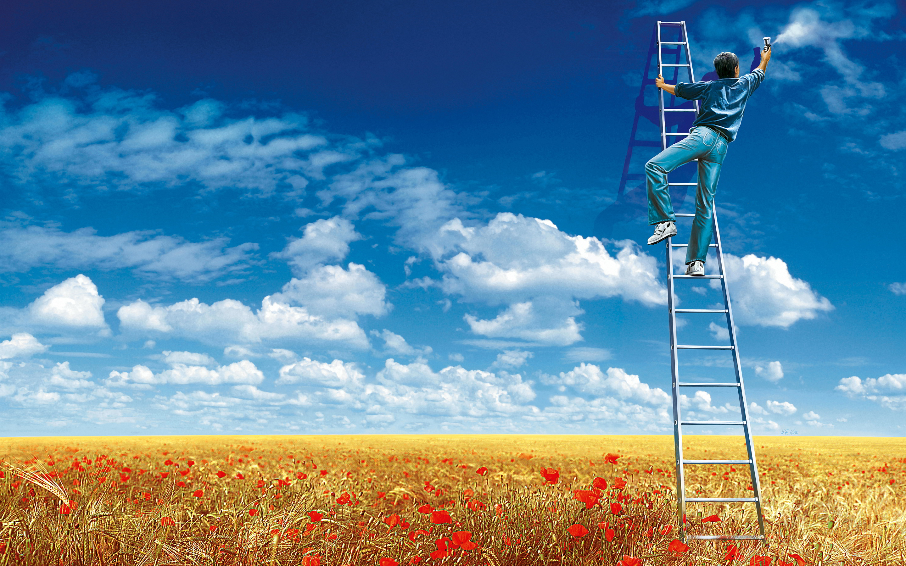 Description: A man climbing a ladder in a field of flowers with a ladder to the sky above him.