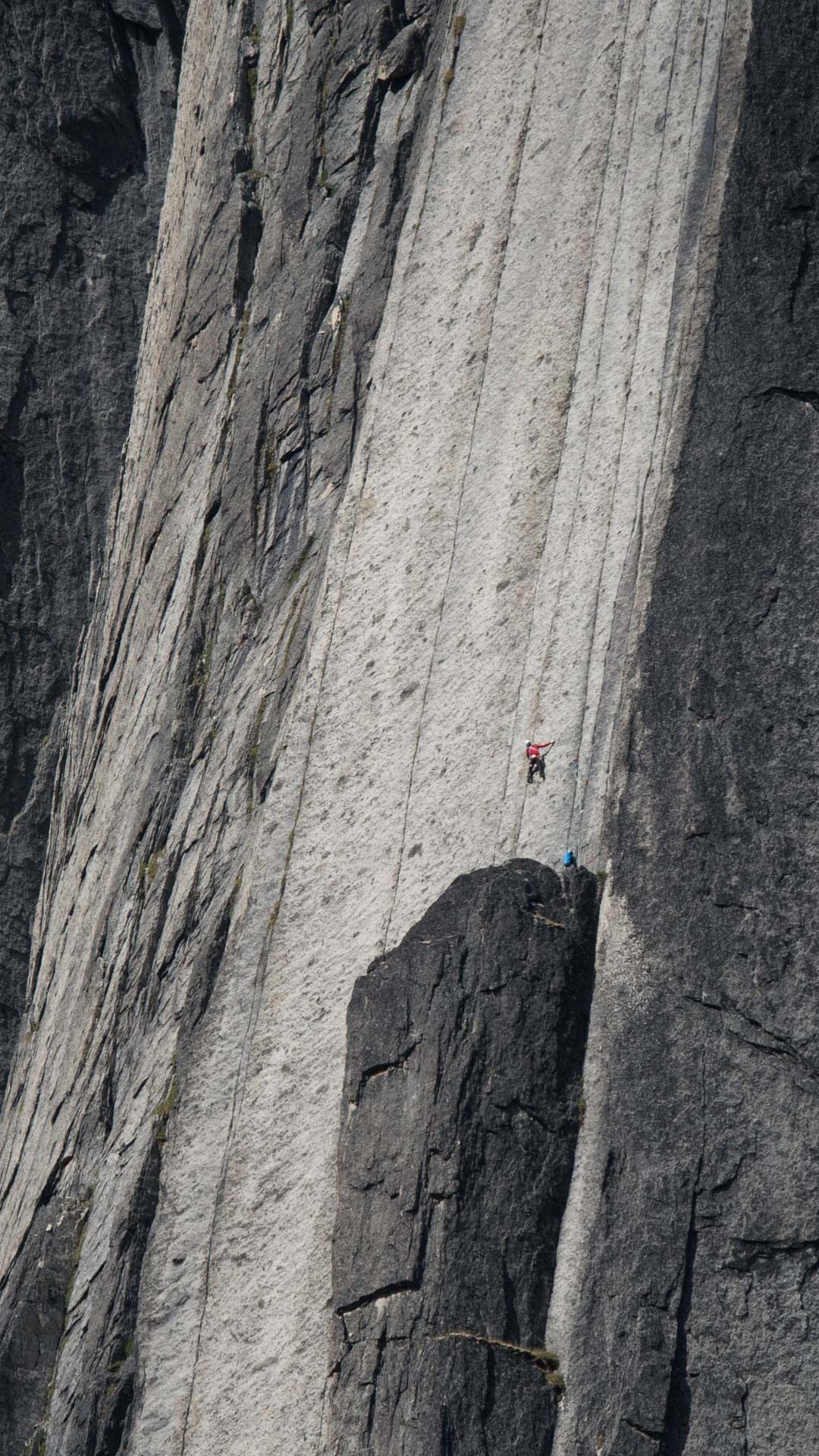 Description: A man climbing up a mountain with a rope attached to it's side and a red flag on the side of the mountain.