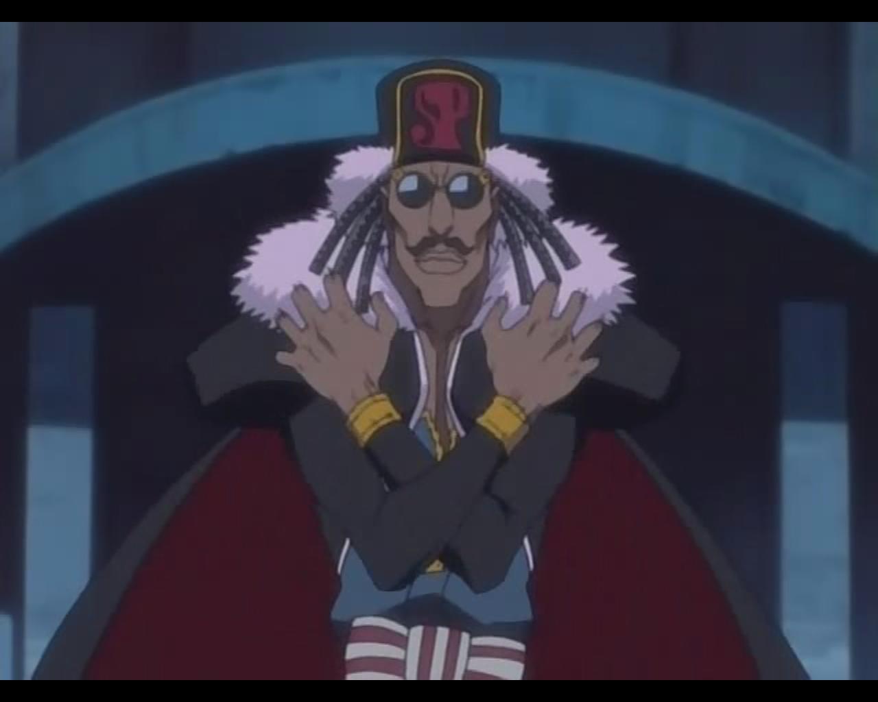 Description: A man in a costume with his arms crossed and his hands folded in front of him.