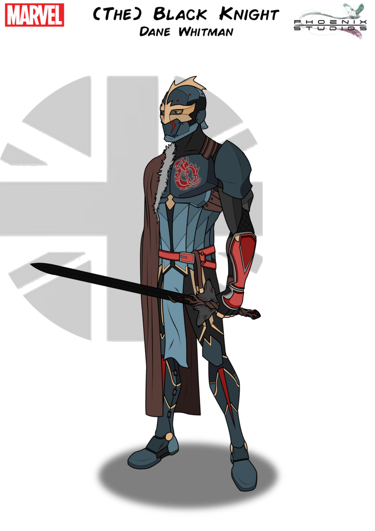 Description: A man in a costume standing next to a black background with a red arrow on it and a black arrow on the right side of the image.