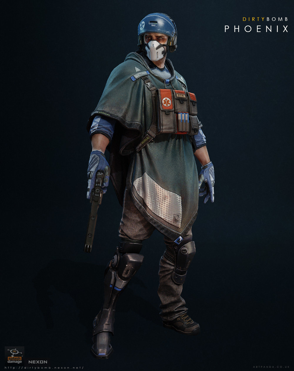 Description: A man in a costume with a gun and helmet on a dark background with a dark background and a black background.