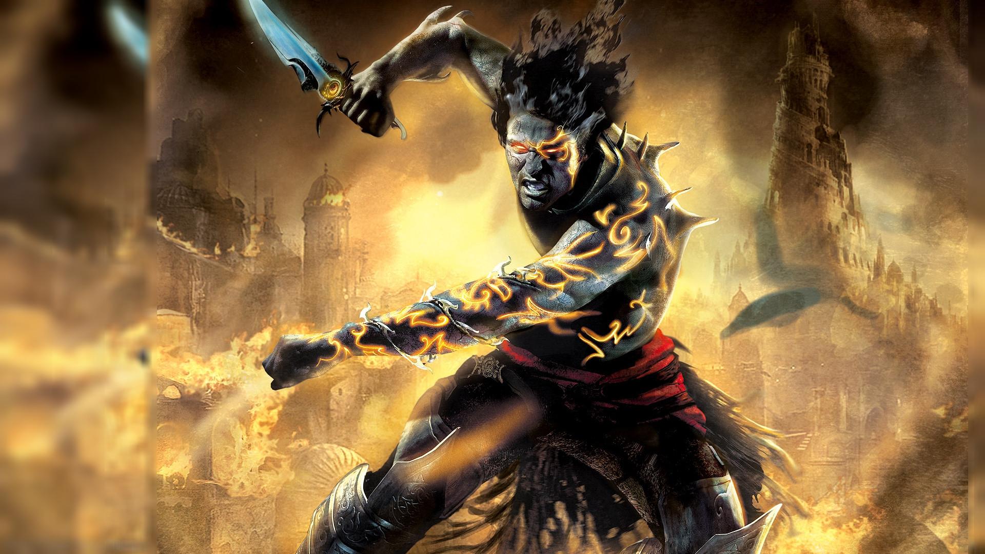 Description: A man in a costume holding a sword in a dark forest with flames and smoke behind him.