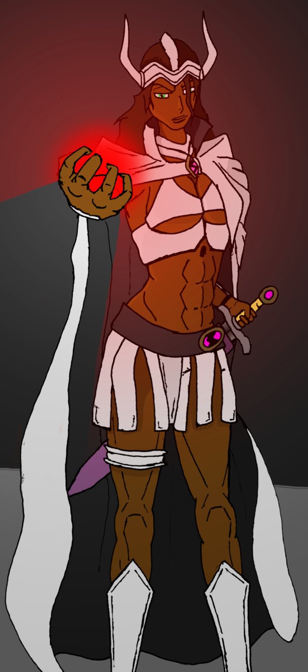 Description: A drawing of a man in a costume holding a sword and a light saber in his hand with a red light shining on his chest.