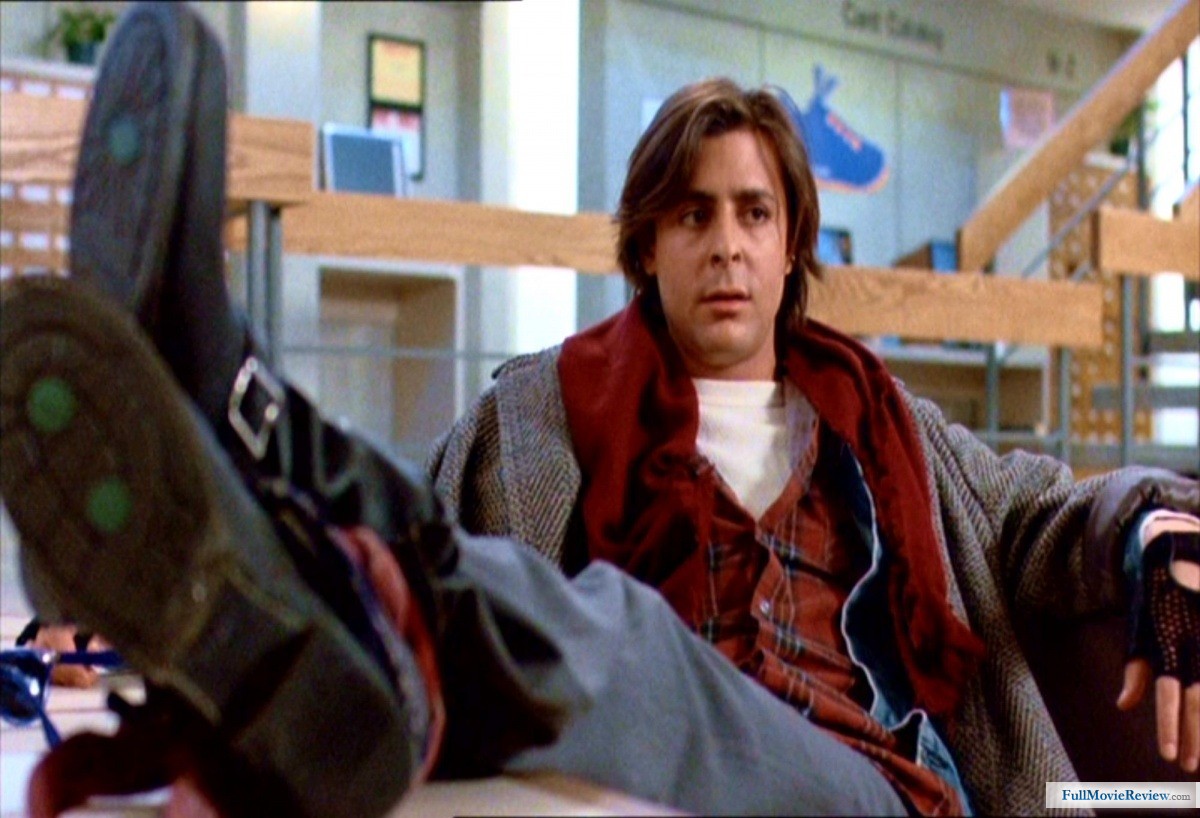 Description: A man sitting on a couch with his foot up on a table in a room with stairs and a staircase.
