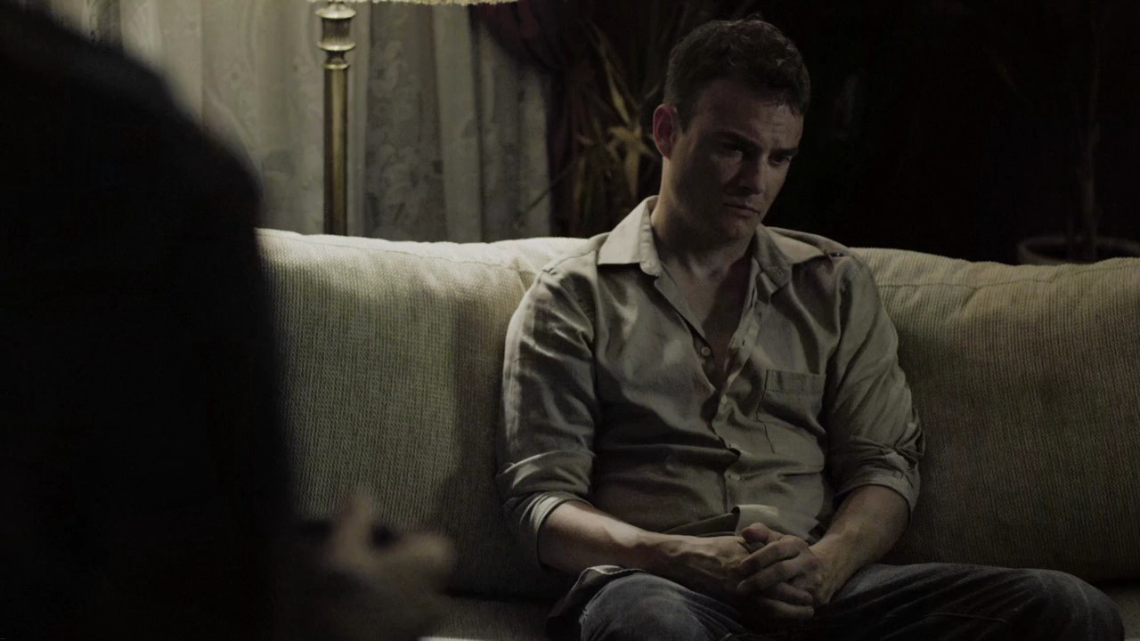 Description: A man sitting on a couch in a living room next to a woman in a black dress shirt and a lamp.