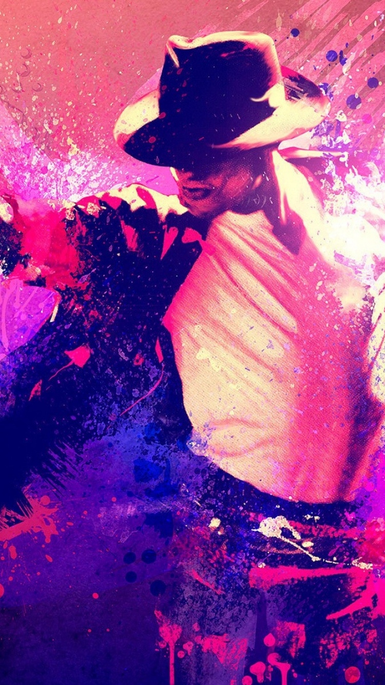Description: A man in a cowboy hat is dancing with paint splatters on the ground and a pink background.
