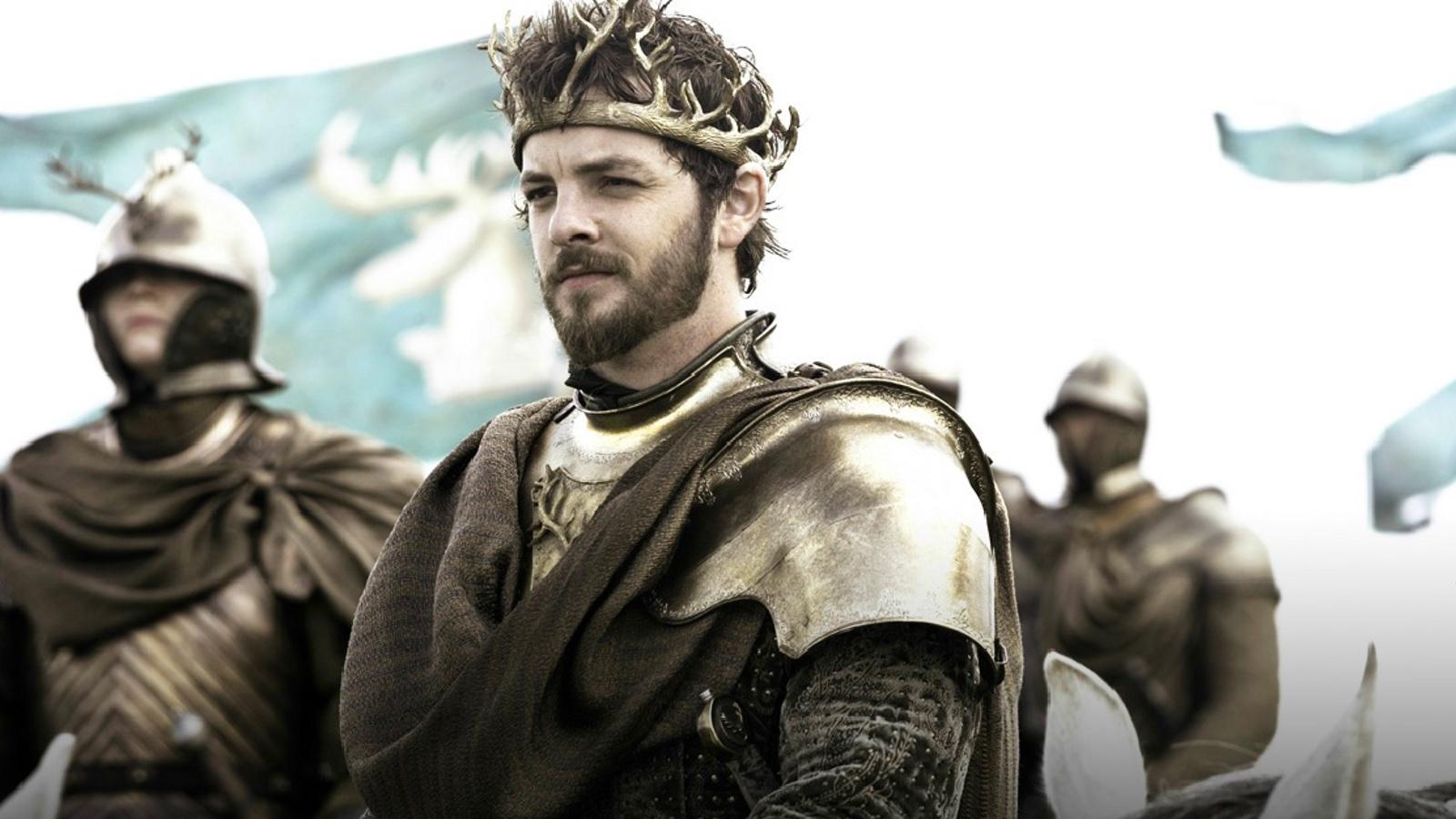 Description: A man in a crown standing next to other men in armor and helmets with flags flying in the background.