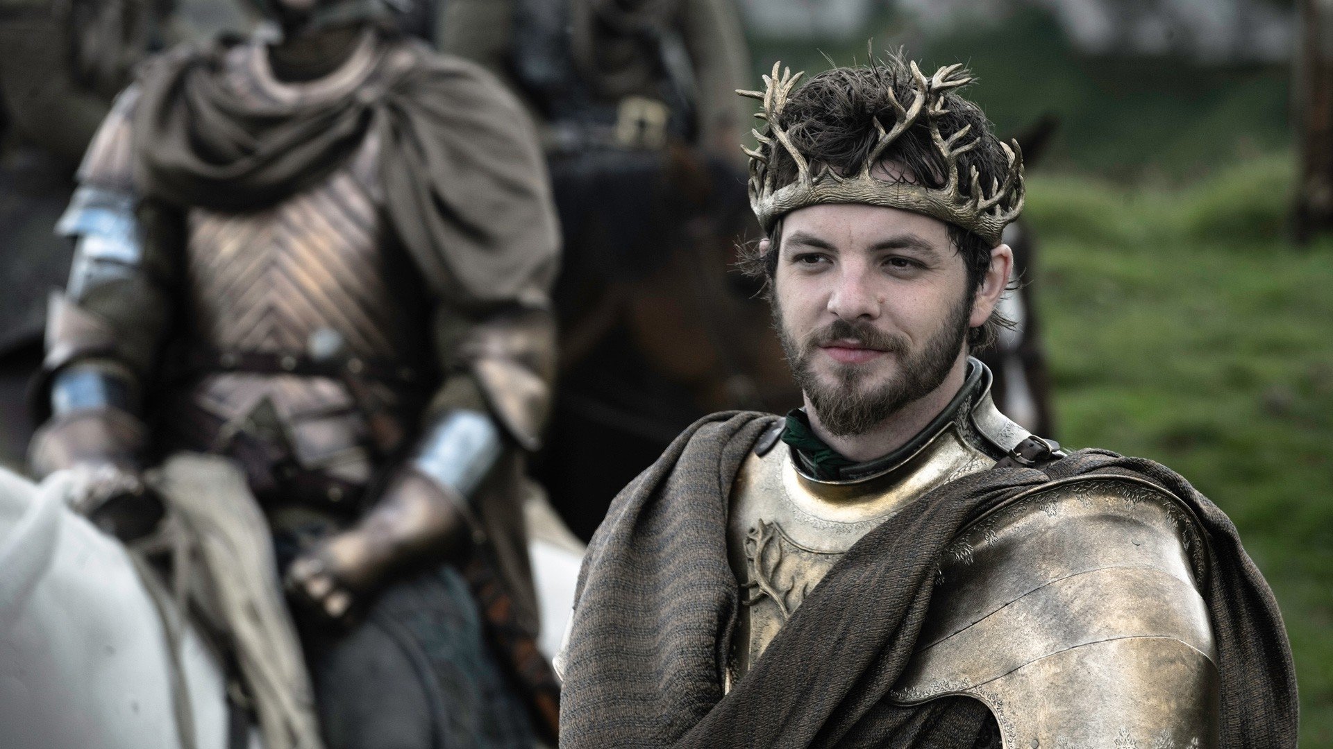Description: A man in a crown standing next to a man in a costume on a horse in a field of grass.