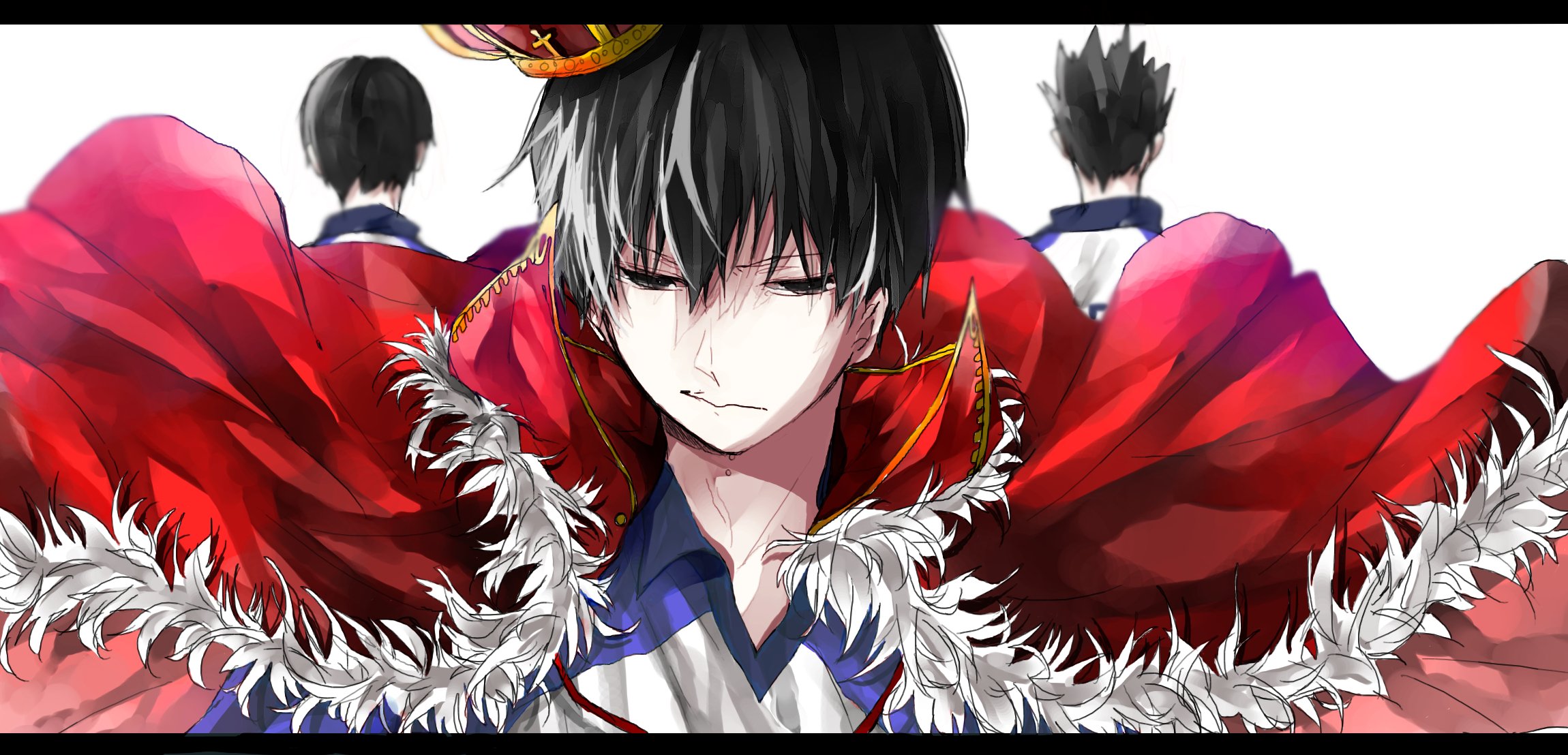 Description: A man with a crown on his head and a red cape over his shoulders.