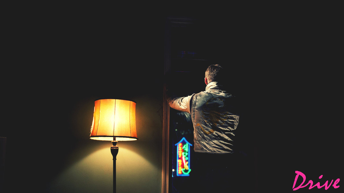 Description: A man standing in a dark room next to a lamp and a sign that says divine on it and a picture of a rainbow.