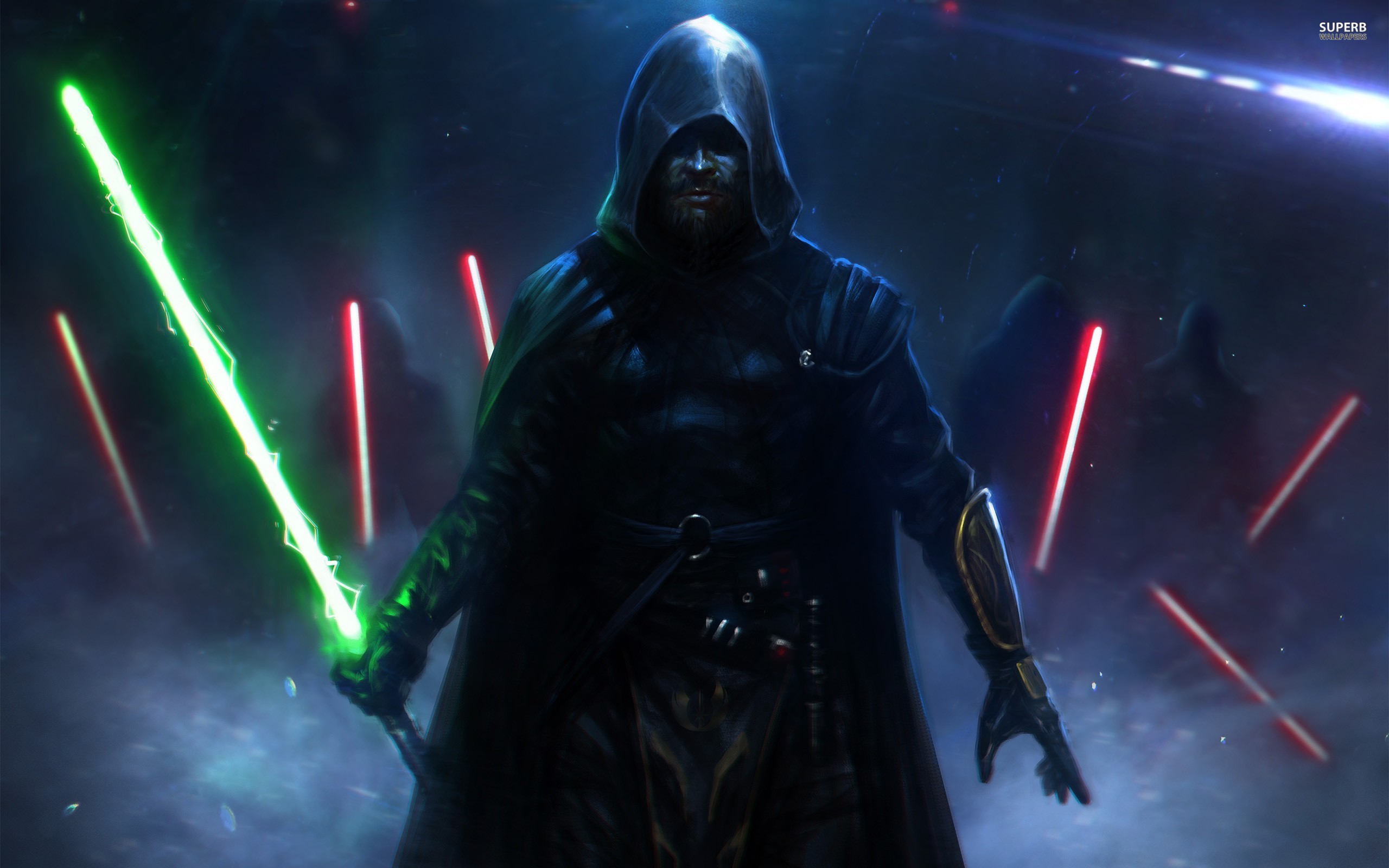 Description: A man in a dark suit holding two lightsabes in his hands and a glowing green light behind him.