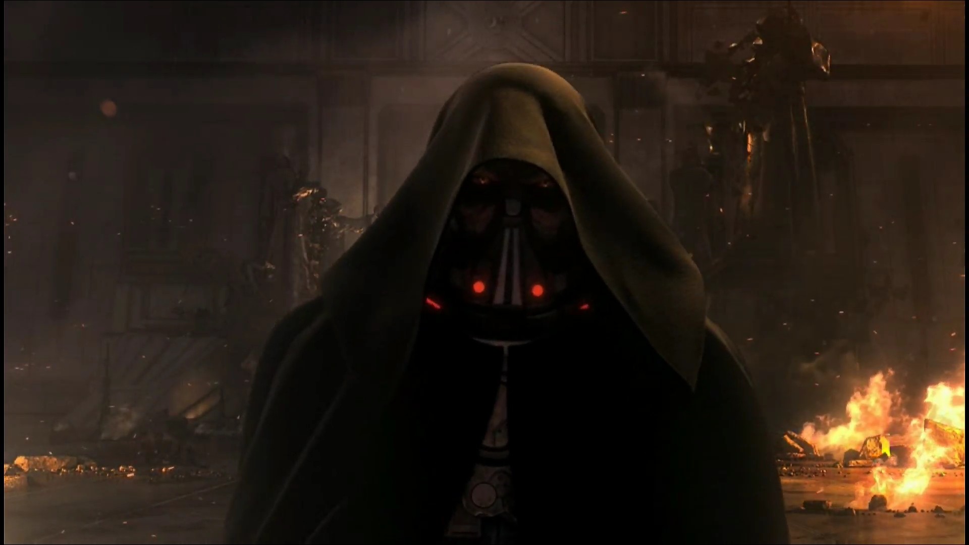 Description: A man in a dark suit with a hood on and a fire in the background behind him in a dark room.