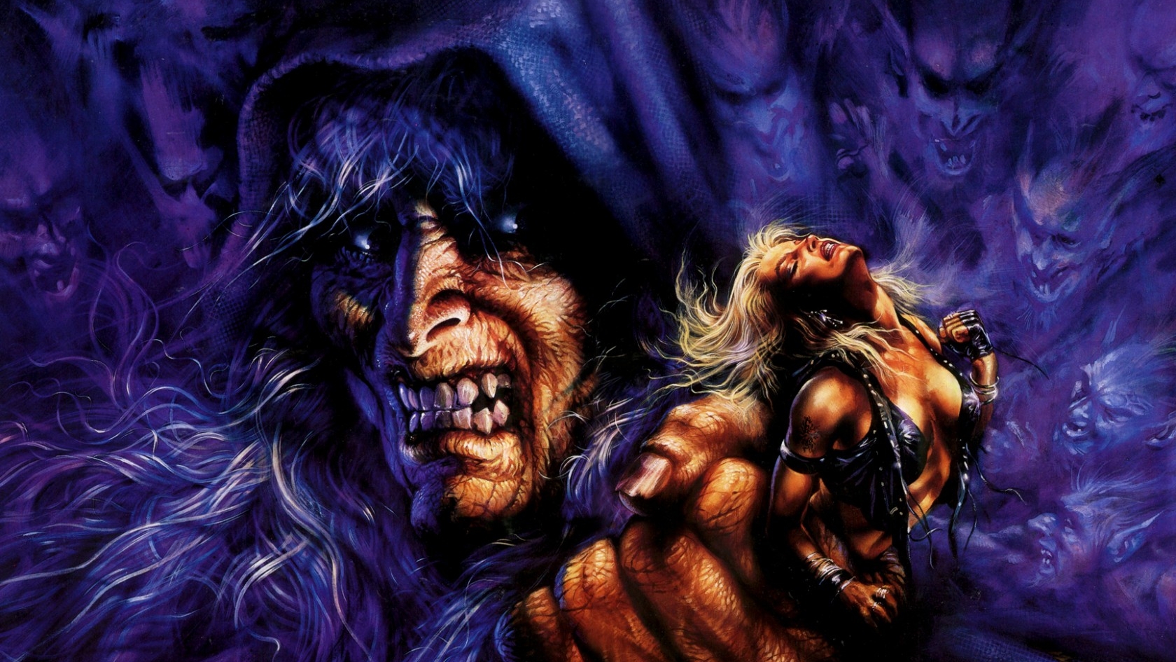 Description: A painting of a man with a demon face and a demon like face on his chest holding a sword.