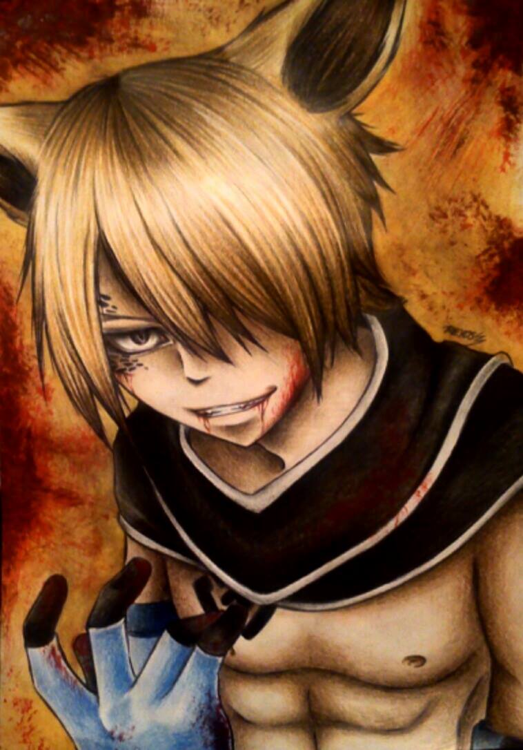 Description: A drawing of a man with a demon head and a demon tail on his head.